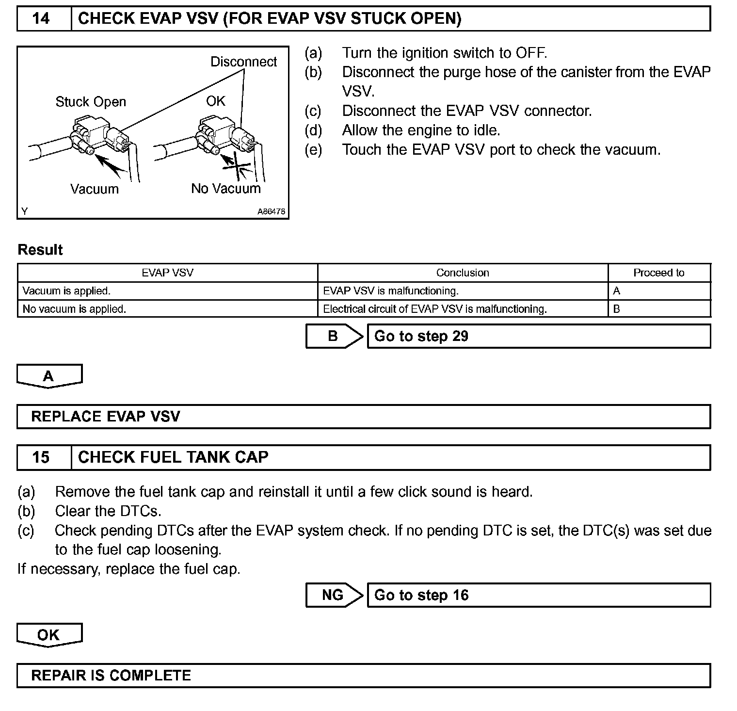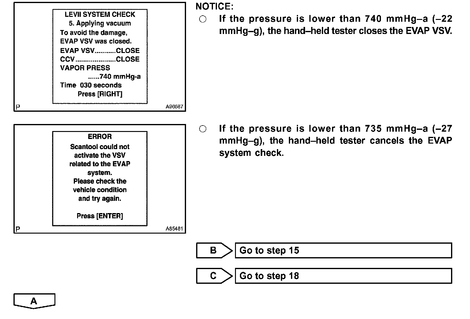 The EVAP monitor's purpose is to check for EVAP leaks and EVAP VSV and CCV malfunctions. The monitor performs the check by first introducing the intake manifold's negative pressure (vacuum) to the EVAP system. Then, the monitor records change in the EVAP system's pressure levels. The monitor runs when the following conditions are met:
