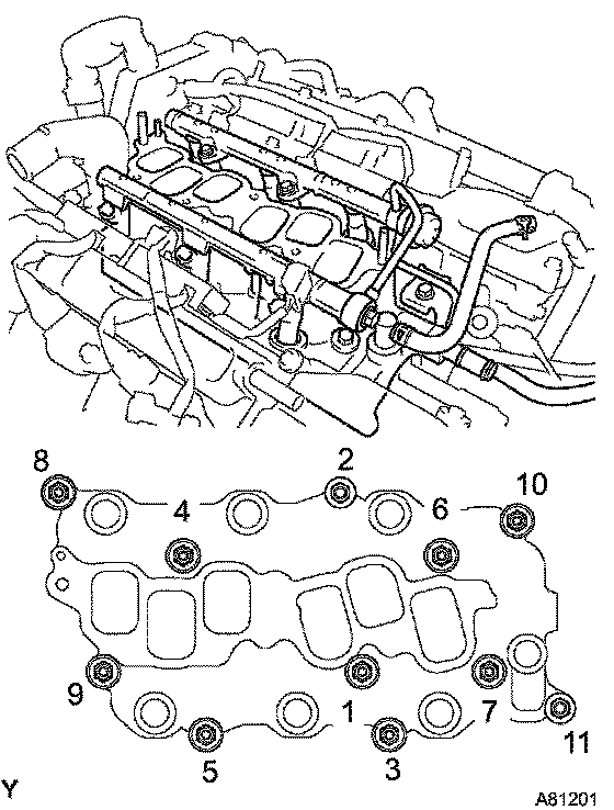 a. Install the intake manifold with the 9 bolts, 2 nuts and 2 washers. Uniformly tighten the bolts and nuts in the sequence shown in the illustration.