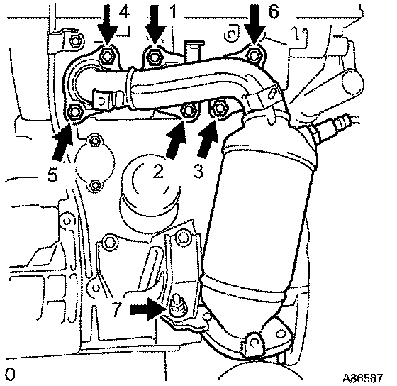 a. Install a new gasket and the converter sub-assembly No. 2 with the 7 nuts. Uniformly, tighten the 7 nuts in the sequence shown in the illustration.