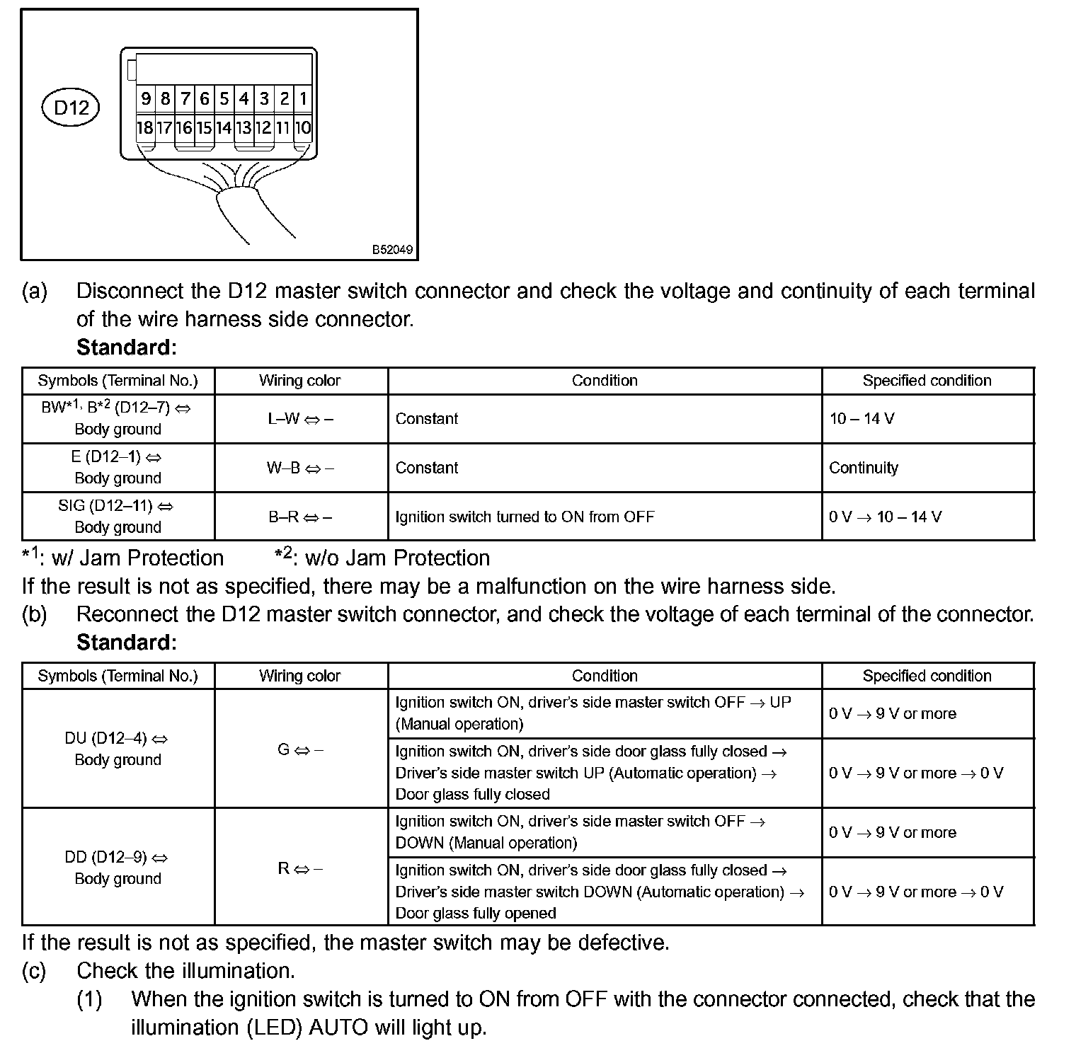 Terminals of Control Module/Pinouts - Check Power Window Regulator Master Switch Assy: