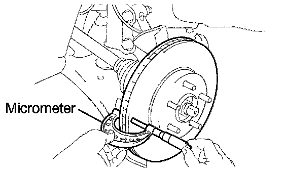 If the runout exceeds the maximum value, change the installation positions of the disc and axle so that the runout will become minimal. If the runout exceeds the maximum even when the installation positions are changed, grind the disc. If the disc thickness is less than the minimum, replace the front disc.
