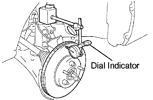 c. Using a dial indicator, measure the disc runout 10 mm (0.39 inch) away from the outer edge of the front disc.