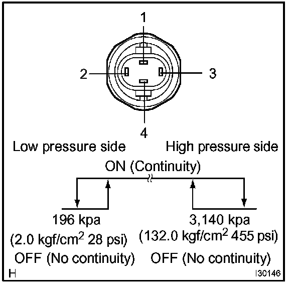3. Check continuity between terminals when refrigerant pressure is changed, as shown in the illustration.