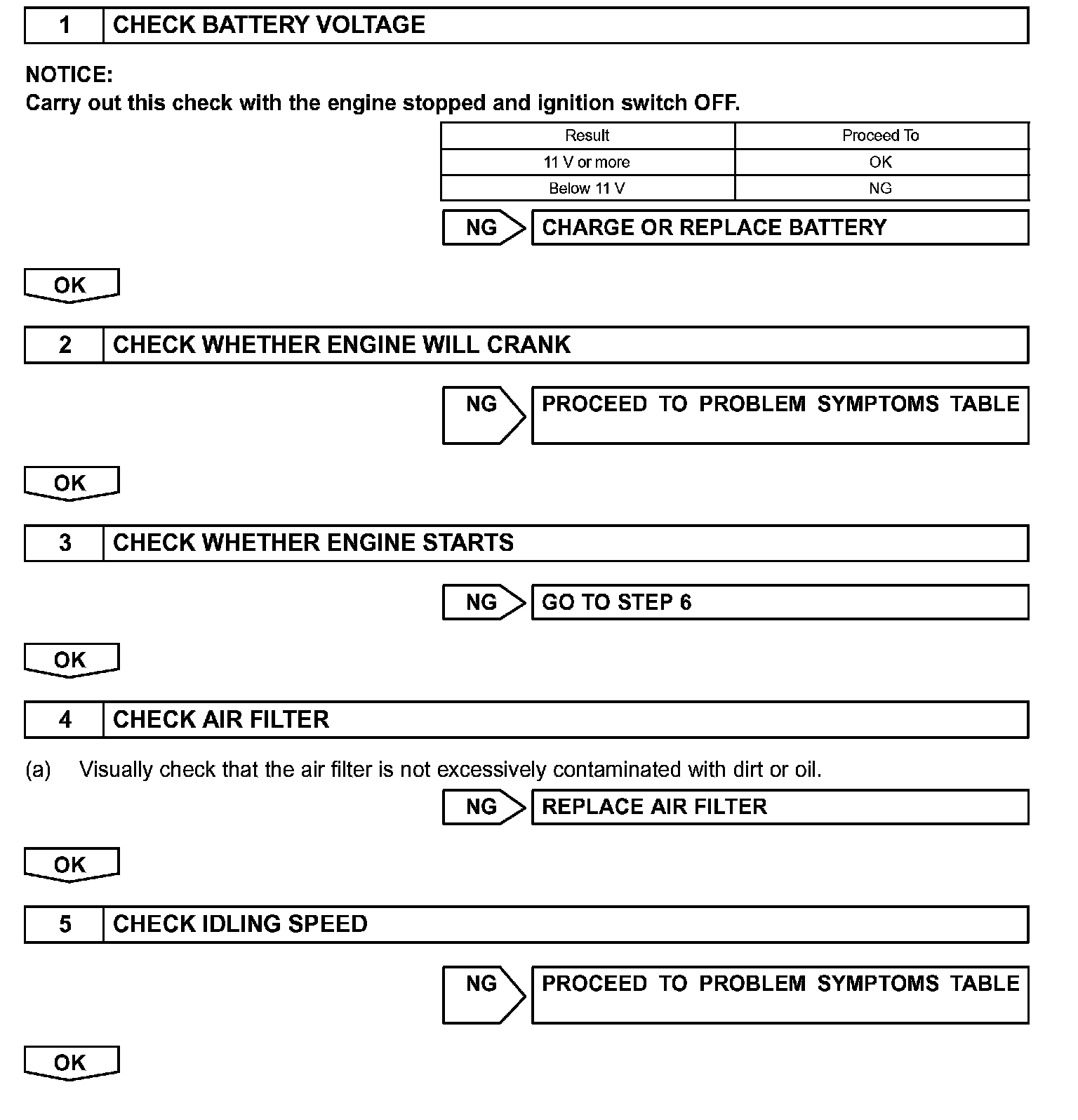 When a malfunction is not confirmed by the DTC check, troubleshooting should be carried out in all circuits considered to be possible causes of the problem. In many cases, by carrying out the basic engine check shown in the flowchart, the location of the problem can be found quickly and efficiently. Therefore, using this check is essential when engine troubleshooting.