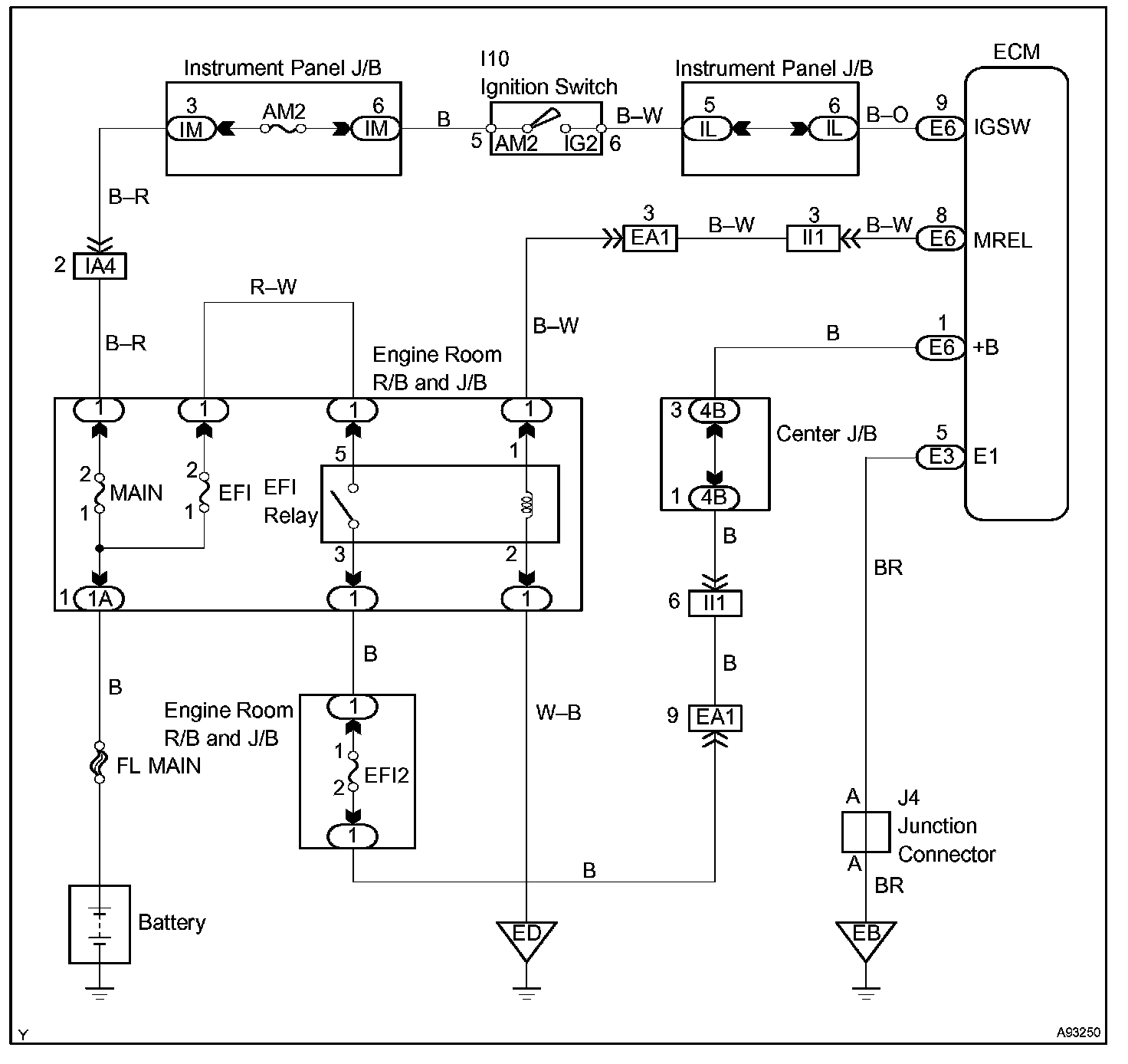 When the ignition switch is turned to ON, the battery voltage is applied to terminal IGSW of the ECM. The ECM MREL output signal causes a current to flow to the coil, closing the contacts of the EFI relay and supplying power to terminal +B of the ECM.