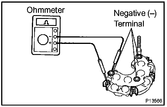 2. Using an ohmmeter, measure the resistance between the negative (-) terminal and each rectifier terminal.