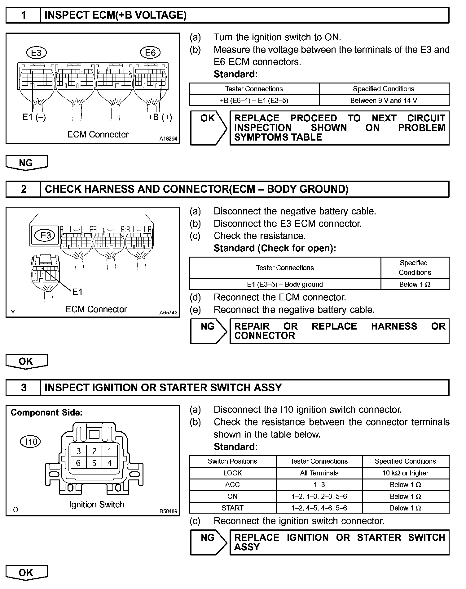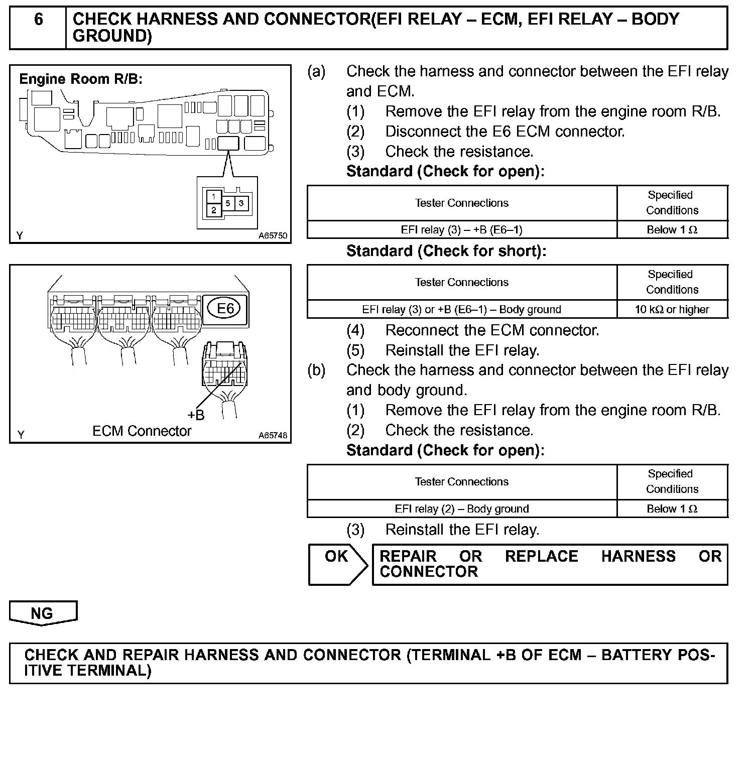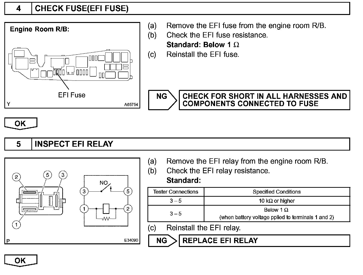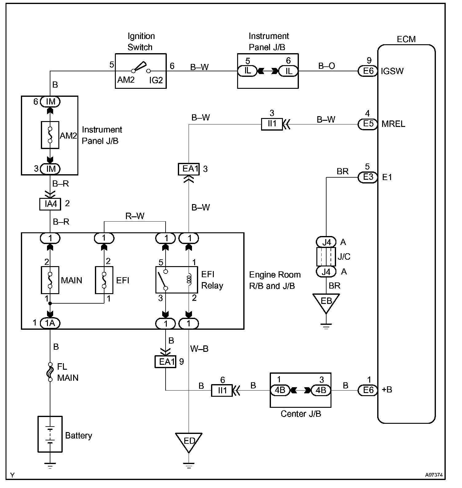 When the ignition switch is turned to ON, the battery voltage is applied to terminal IGSW of the ECM. The ECM MREL output signal causes a current to flow to the coil, closing the contacts of the EFI relay and supplying power to terminal +B of the ECM.