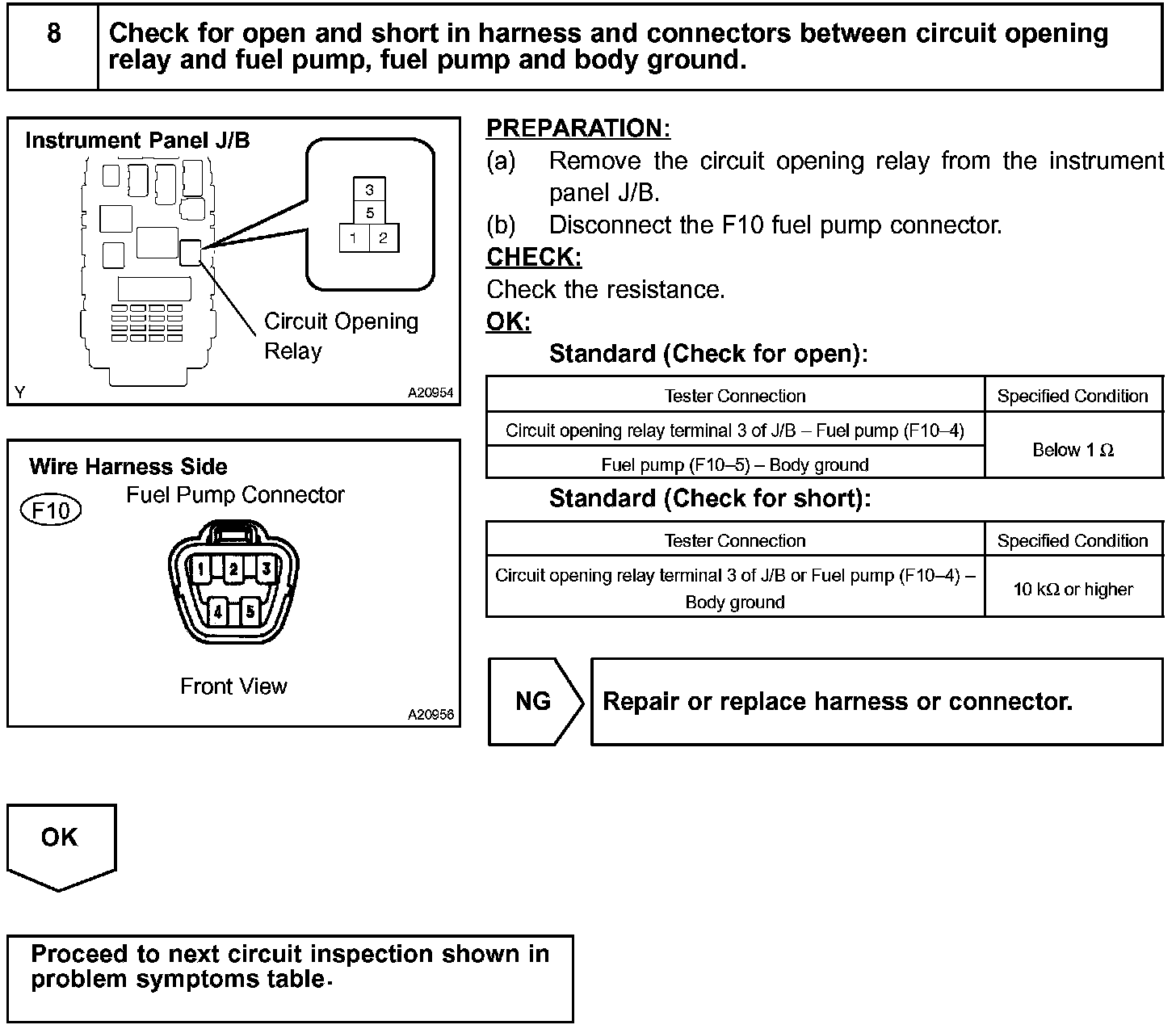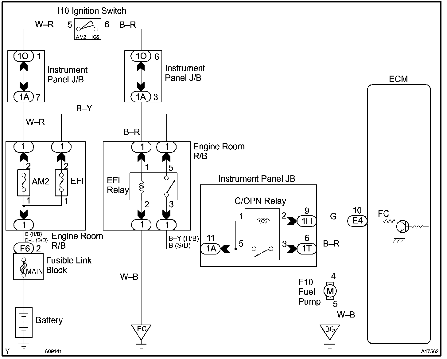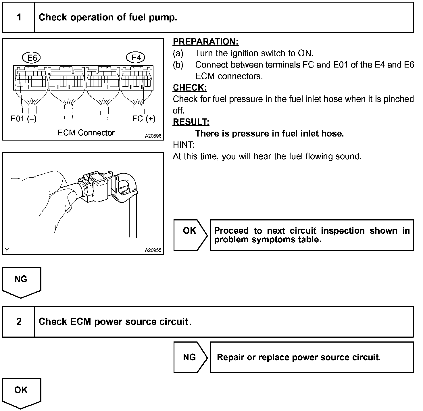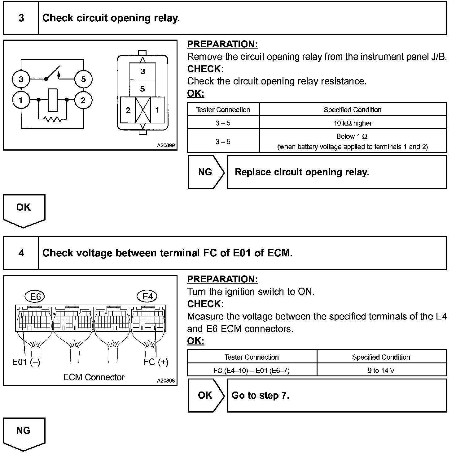 When the STA signal and NE signal are input to the ECM, Tr is turned ON, current flows to the coil of the circuit opening relay, the relay switches on, power is supplied to the fuel pump and the fuel pump operates. While the NE signal is generated (engine running), the ECM keeps Tr ON (circuit opening relay ON) and the fuel pump also keeps operating.