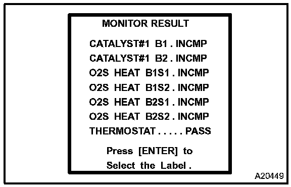 The Monitor Result is part of the monitoring for malfunctions in emission related components such as the thermostat, catalytic converter, and evaporative emission system. The various states (Test Items) of the components are monitored by the ECM. The Test Item values (Test Values) can be read using a hand-held tester or OBD II scan tool.