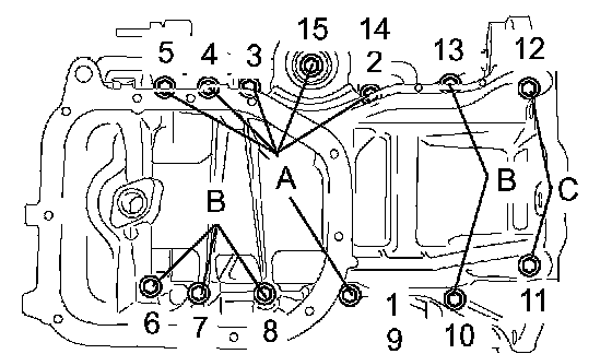 Install and uniformly tighten the 13 bolts, in several passes, in the sequence shown.