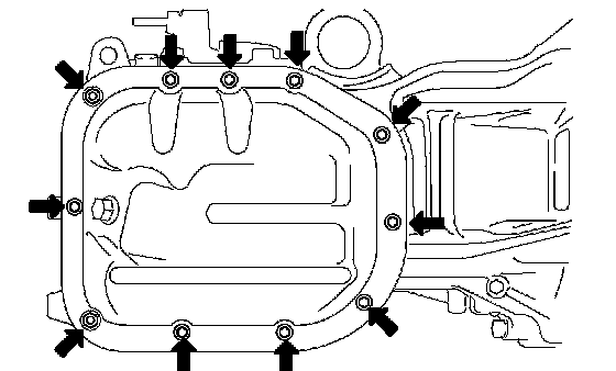Install the oil pan with the 9 bolts and 2 nuts. Uniformly tighten the bolts and nuts in several passes.