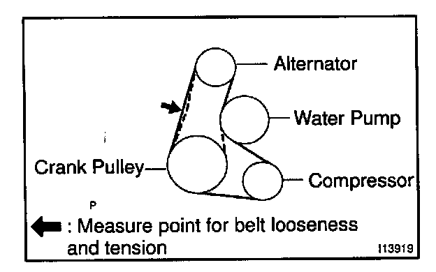 - After installing a new belt, run the engine for about 5 minutes and recheck the belt tension.