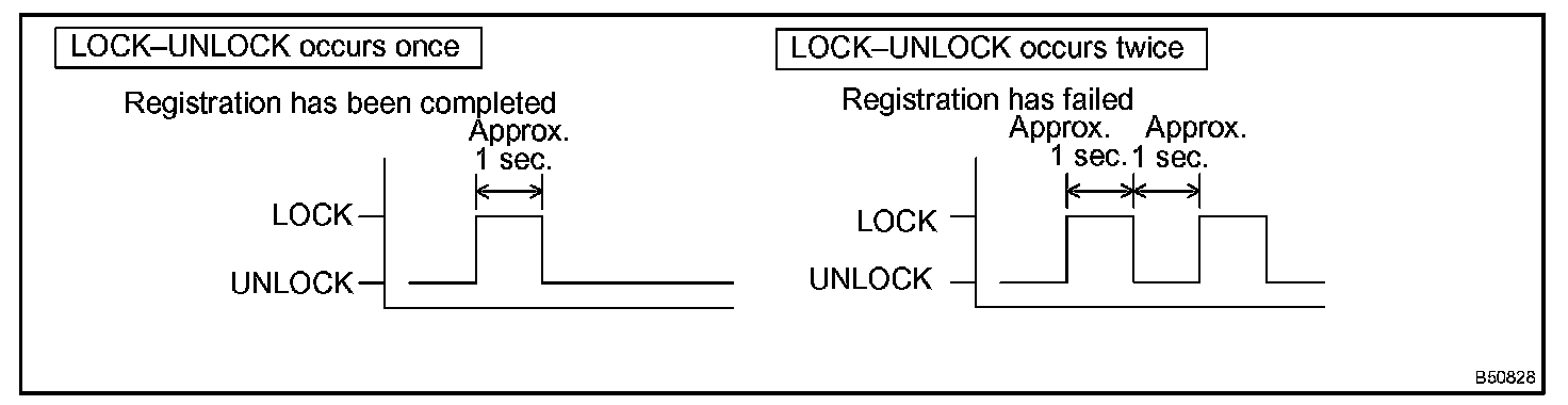 2. LOCK-UNLOCK operation is automatically performed once within 3 seconds after above operation (step 1), when the recognition code of the transmitter has been registered correctly. If the LOCK-UNLOCK operation is performed twice, the registration of the recognition code has failed. In this case, register the recognition code from the beginning of the registration procedures once again.
