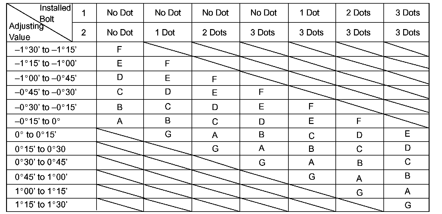 Check installed bolts combination. Select appropriate bolts from the table to adjust the camber to within the specified range.