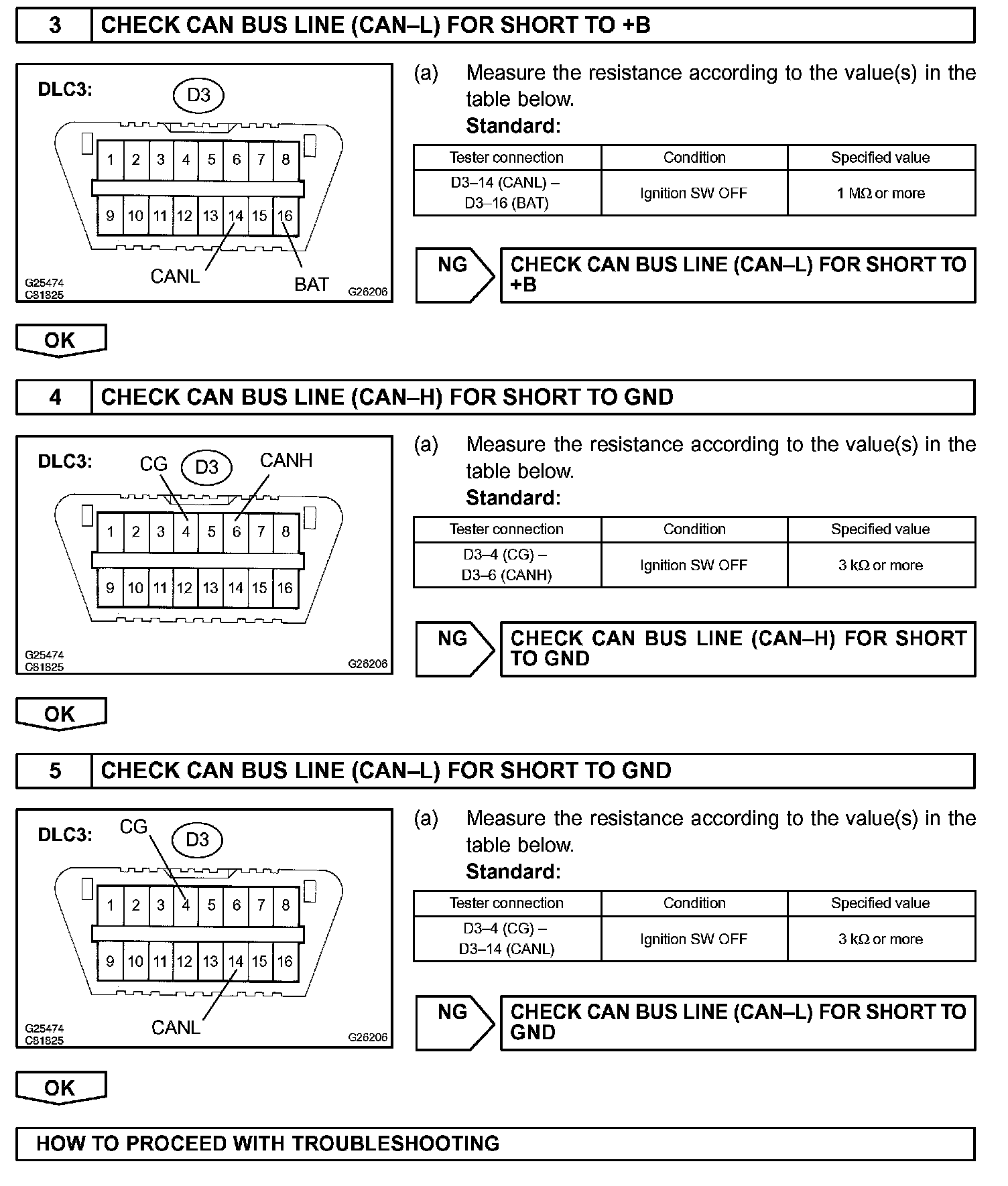 When any DTC for the CAN communication is output, first measure the resistance between the terminals of DLC3 to specify the trouble area.