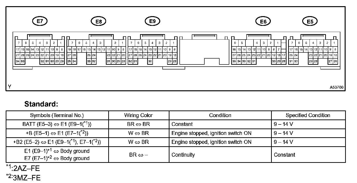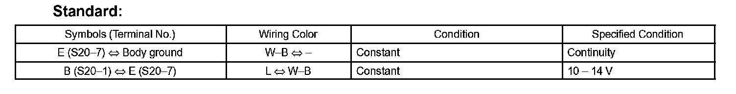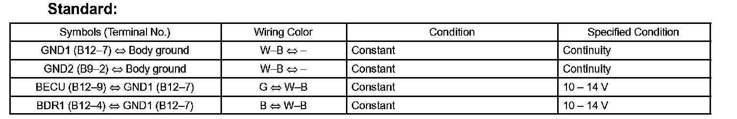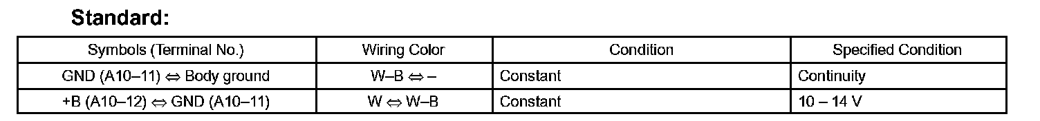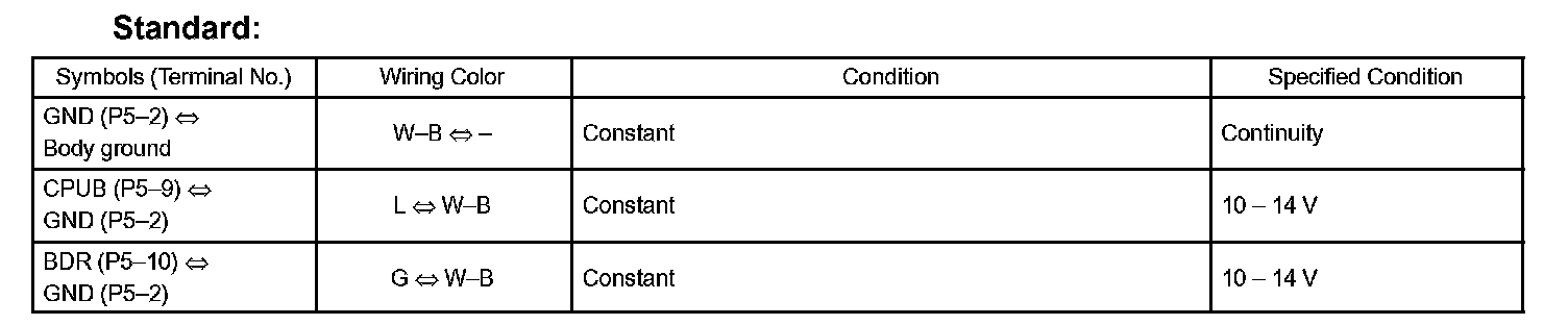 - Before the measurement, check the power source voltage (10 - 14 V when IG ON) and body ground (5 Ohm or less between each ground terminal and the engine body, when IG OFF).