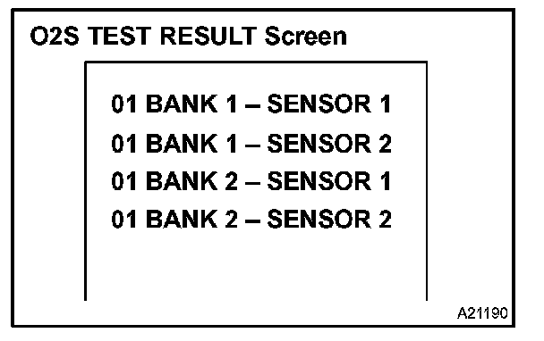 b. On the tester screen, select the following menus: DIAGNOSIS / CARB OBD II / O2S TEST RESULT. A list of the O2S equipped on the vehicle will be displayed.