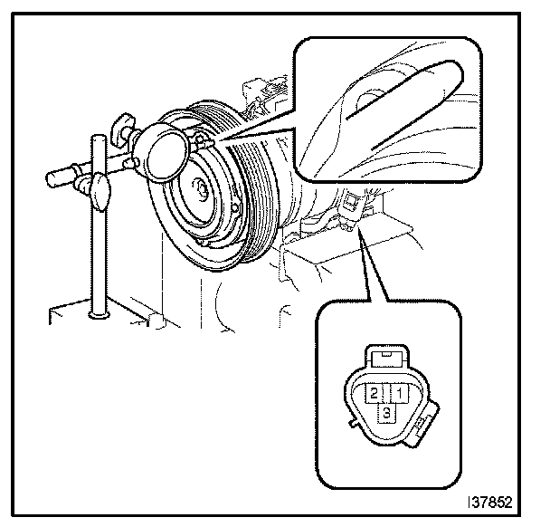 b. Connect the positive battery lead to terminal 3 of the magnet clutch connector and the negative lead to the earth wire. Turn on and off the magnet clutch and measure the clearance.