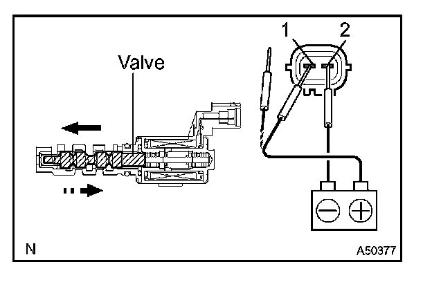 b. Connect the battery's positive (+) lead to terminal 1 and negative (-) lead to terminal 2, and check the movement of the valve.