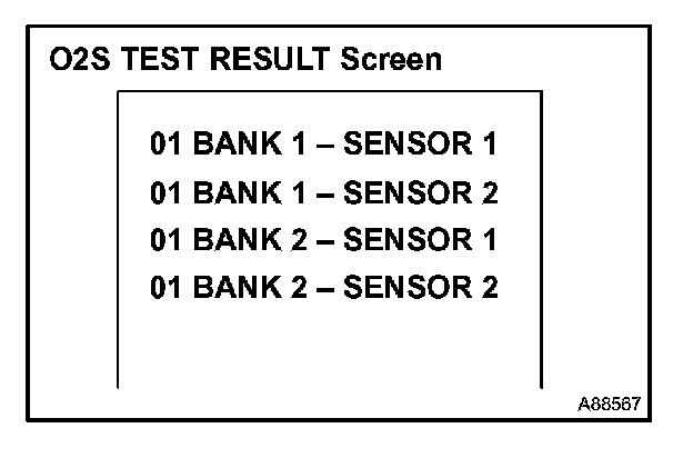 b. On the tester screen, select the following menus: DIAGNOSIS/CARB OBDII/O2S TEST RESULT. A list of the O2S equipped on the vehicle will be displayed.