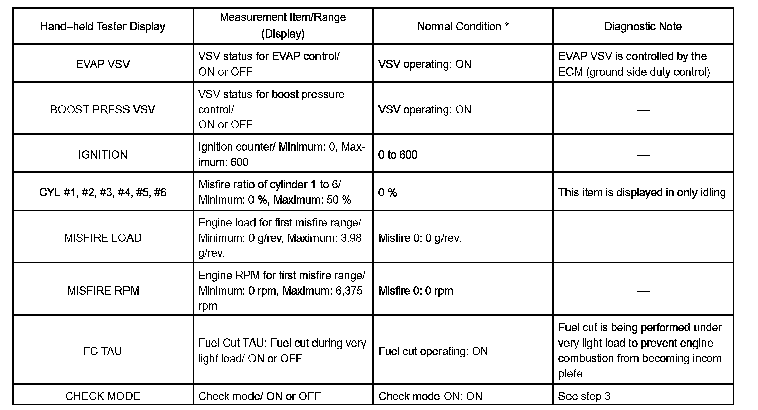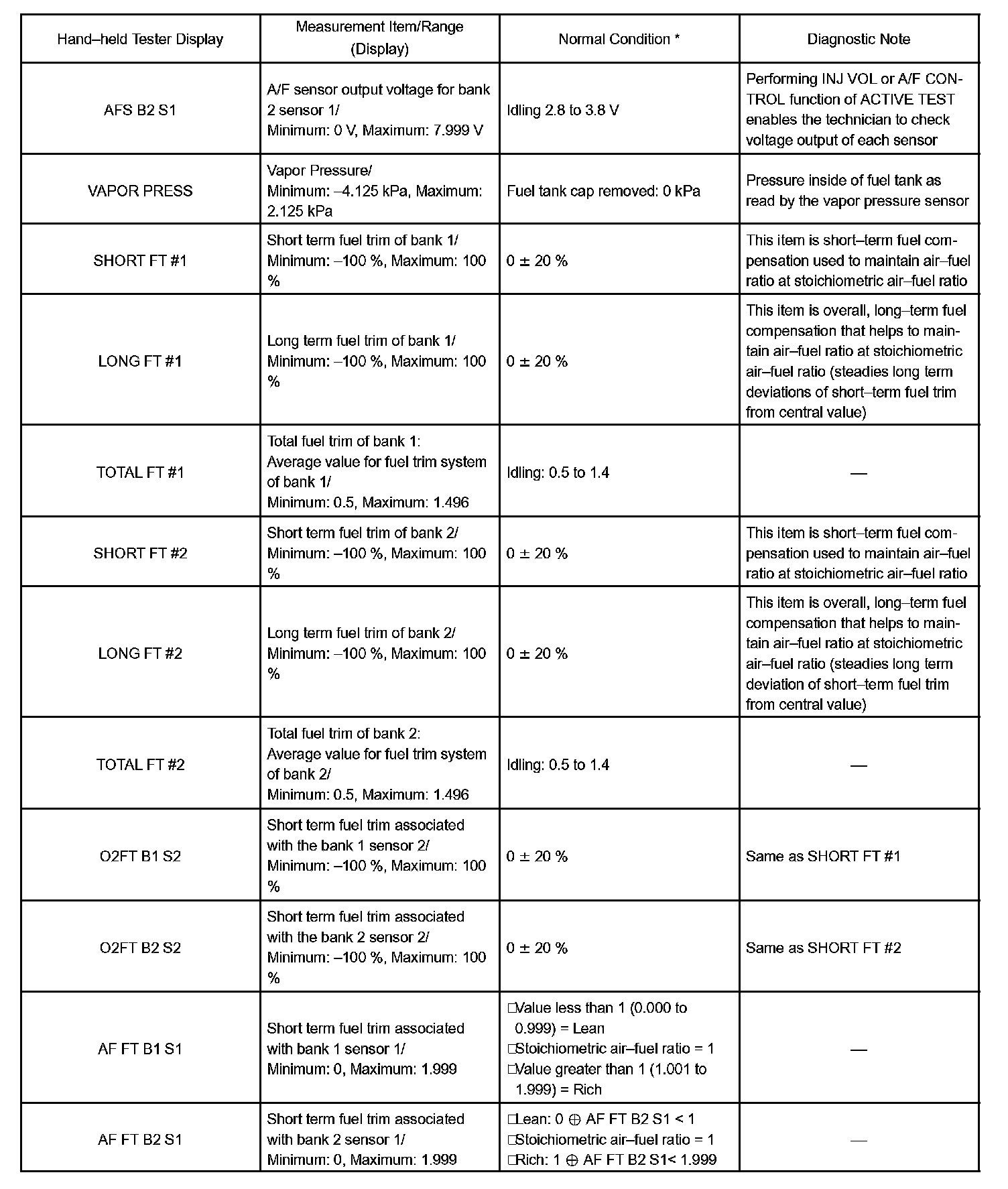 HINT: *: If no conditions are specifically stated for "Idling", the shift lever is in the N or P position, the A/C switch is OFF and all accessory switches are OFF.