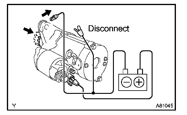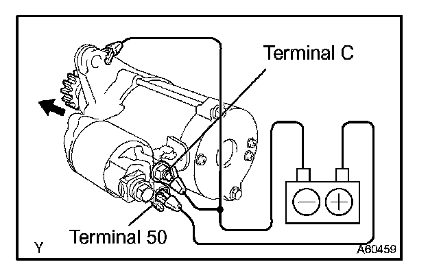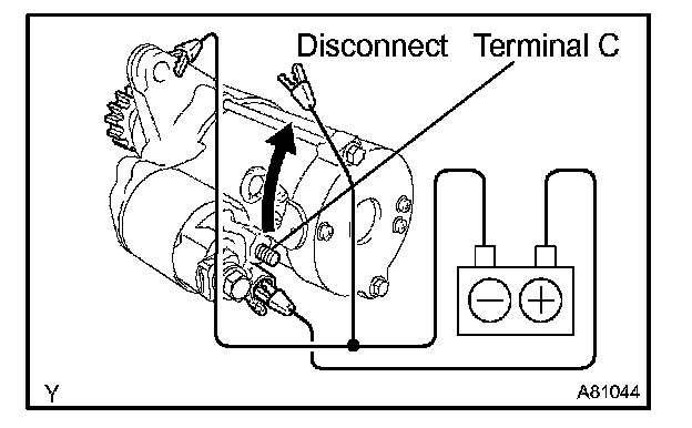 1. Maintain the battery connections in step (a), but disconnect the negative (-) lead from terminal C. Check that the pinion gear remains extended.