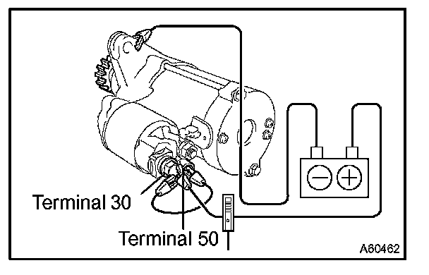 2. Connect the battery to the magnetic switch as shown in the illustration on the left. Check that the clutch pinion gear extends.