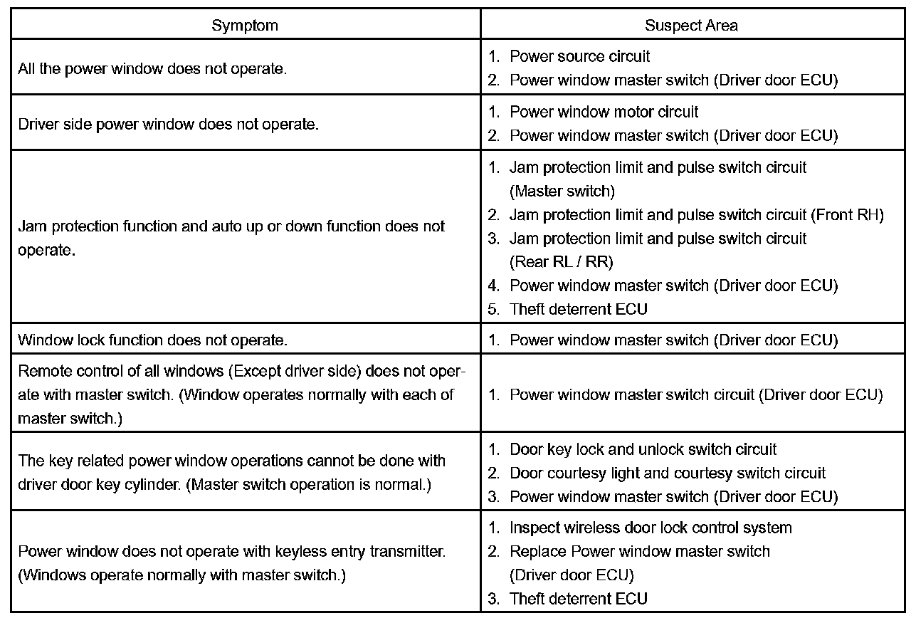 Problem Symptoms Table - Power Window Control System: