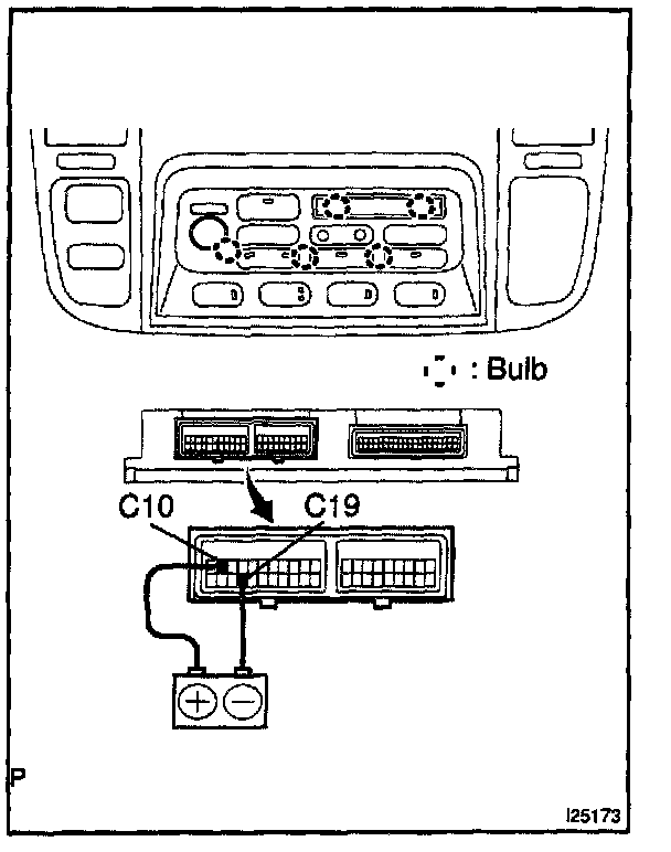 a. Connect the positive (+) lead from the battery to terminal C10 and negative (-) lead to terminal C19, then check that the indicators illuminate.