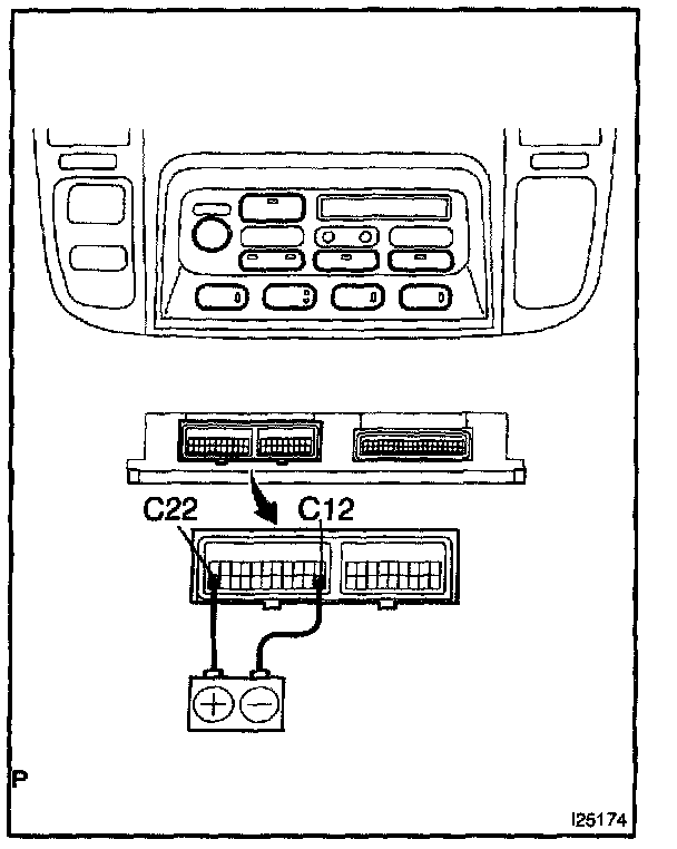 a. Connect the positive (+) lead from the battery to terminal C22 and negative (-) lead to terminal C12.