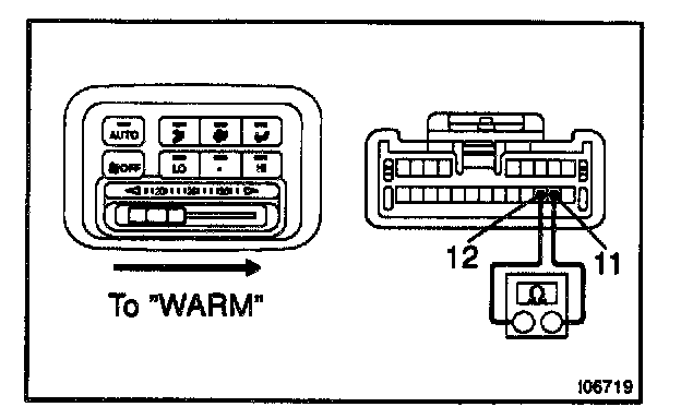 b. Gradually move the temperature control lever from "COOL" side to "WARM" side then check that the resistance between terminals 11 and 12 increase from 0 to 3.0 kohm.