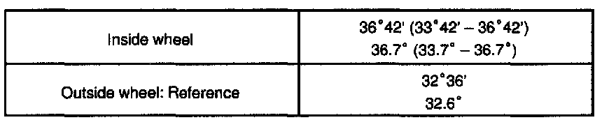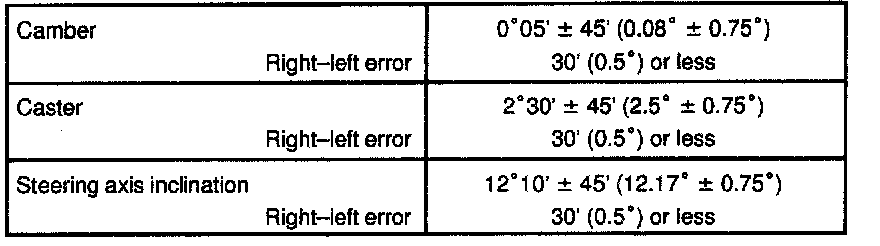 If the steering axis inclination is not within the specified value, after the camber and caster have been correctly adjusted, recheck the steering knuckle and front wheel for bearing or looseness.
