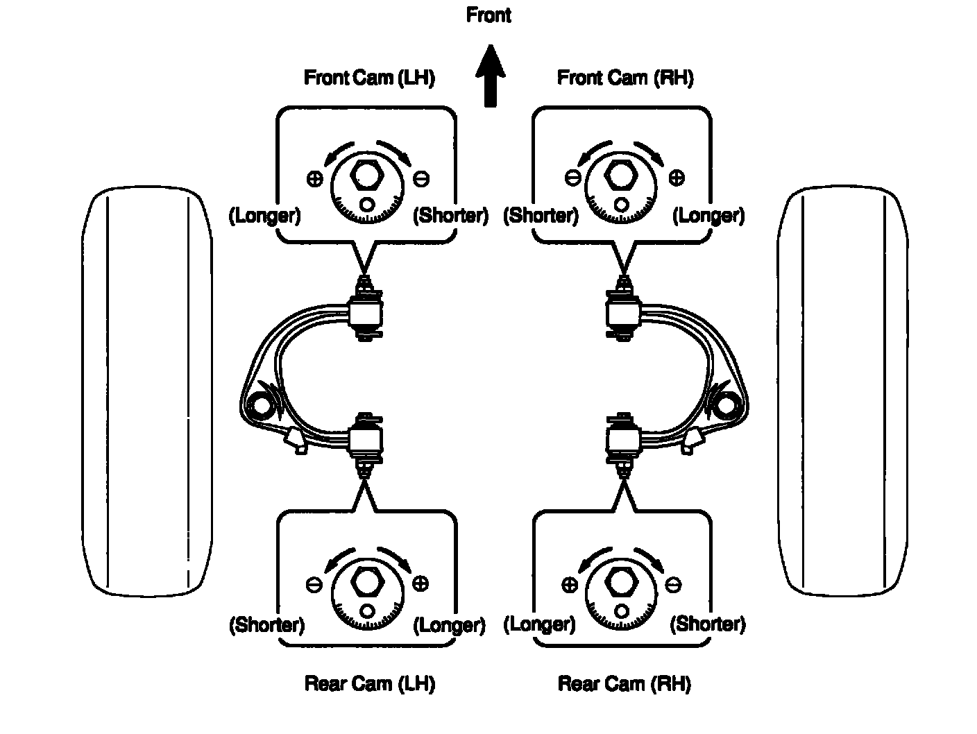 b. Adjust the camber and caster by front and/or rear adjusting cams.