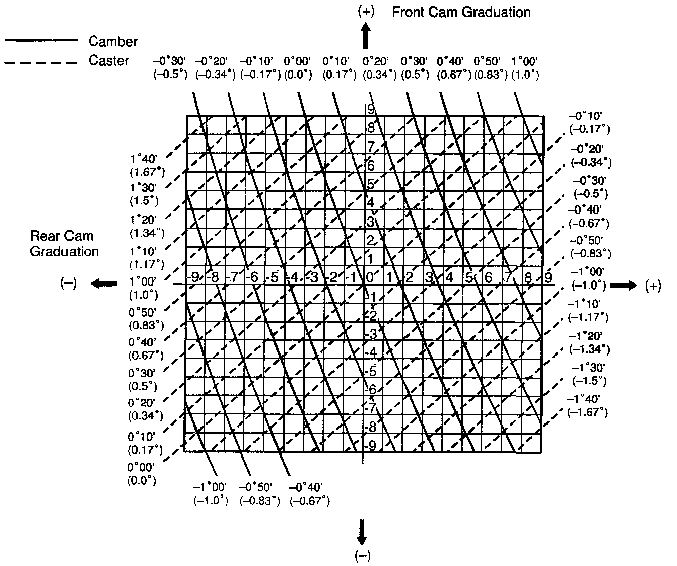 3. As shown in the chart, read the distances from the marked point to 0 point, and adjust the front and/or rear adjusting cams accordingly.