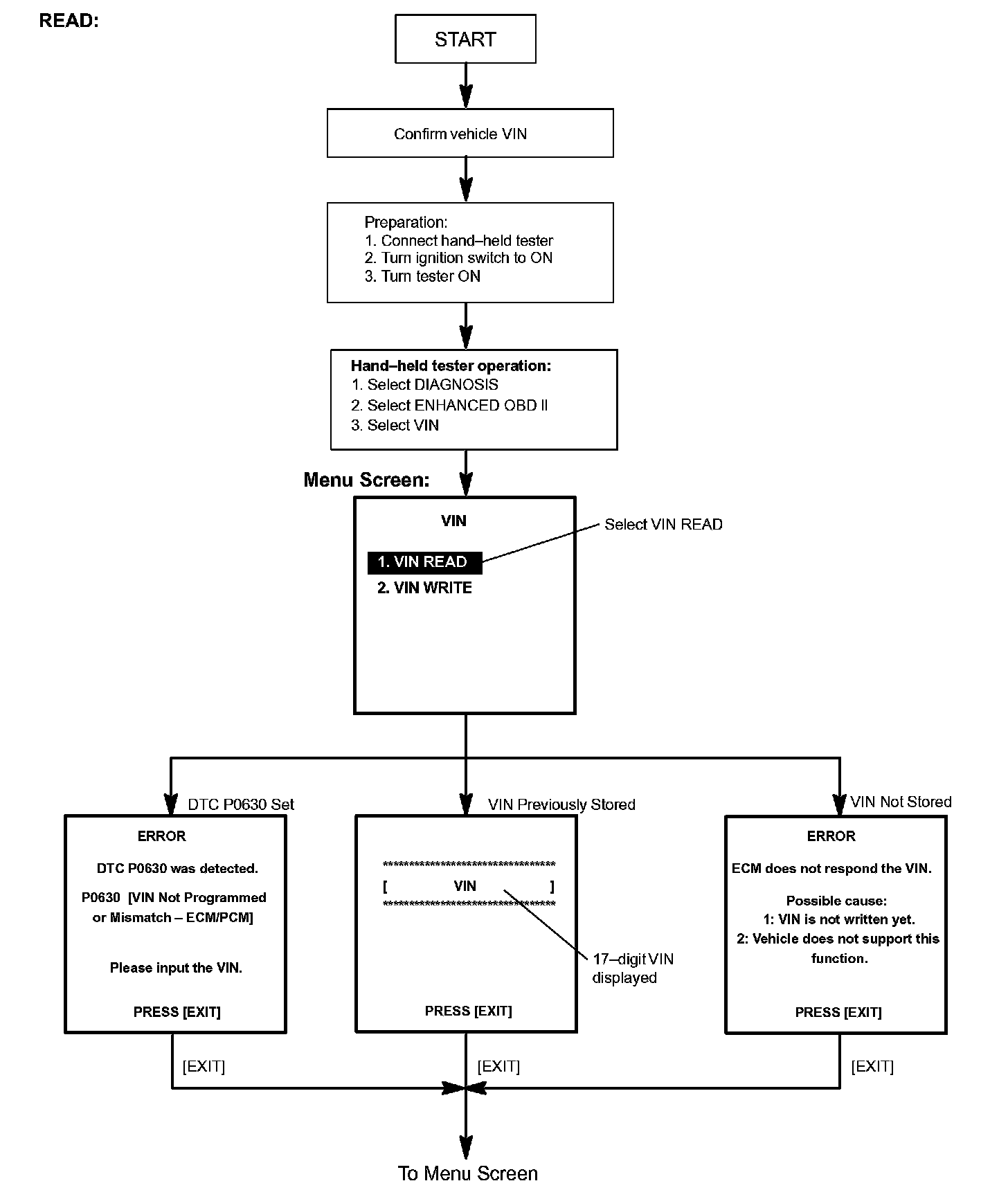 b. Read VIN: Explains the VIN reading process in a flowchart. This process allows the VIN stored in the ECM to be read, in order to confirm that the two VINs, provided with the vehicle and stored in the vehicle's ECM, are the same.