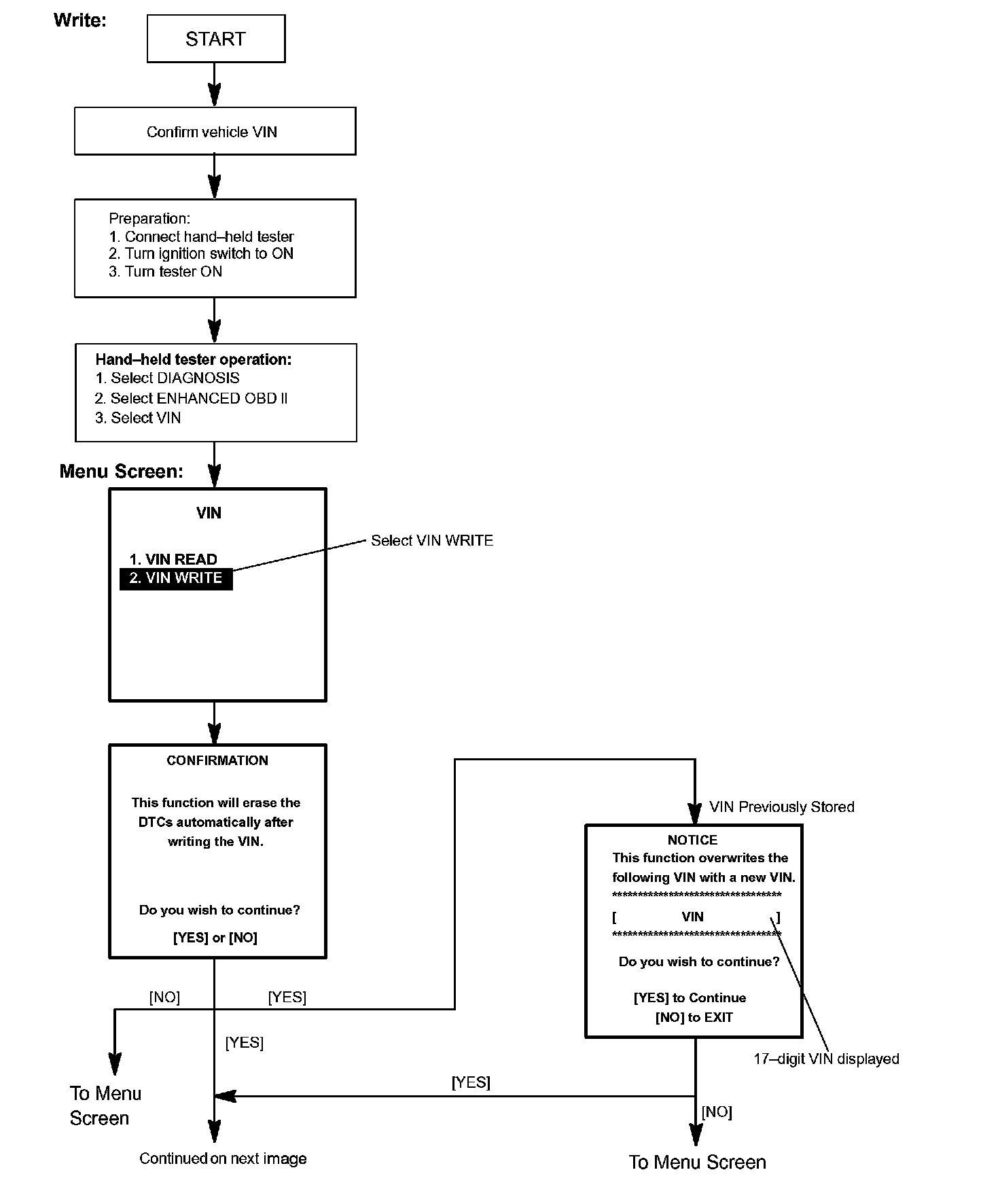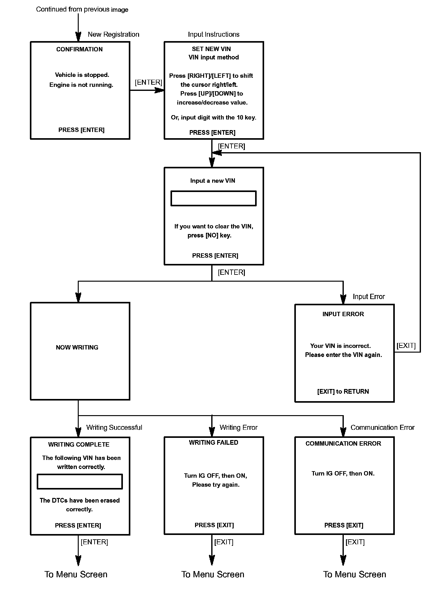 c. Write VIN: Explains the VIN writing process in a flowchart. This process allows the VIN to be input into the ECM. If the ECM is changed, or the VIN and VIN do not match, the VIN can be registered, or overwritten in the ECM by following this procedure.