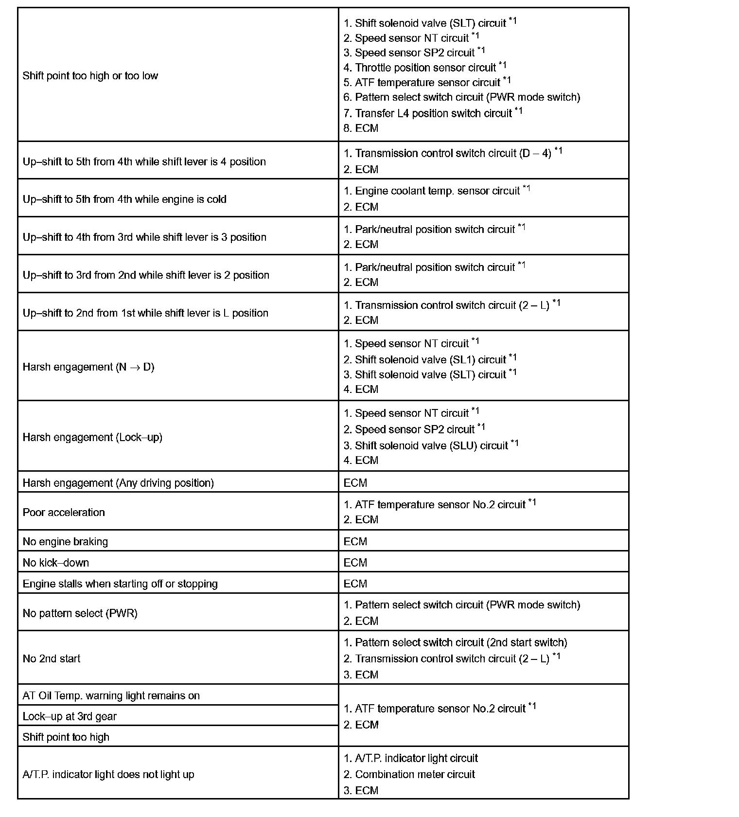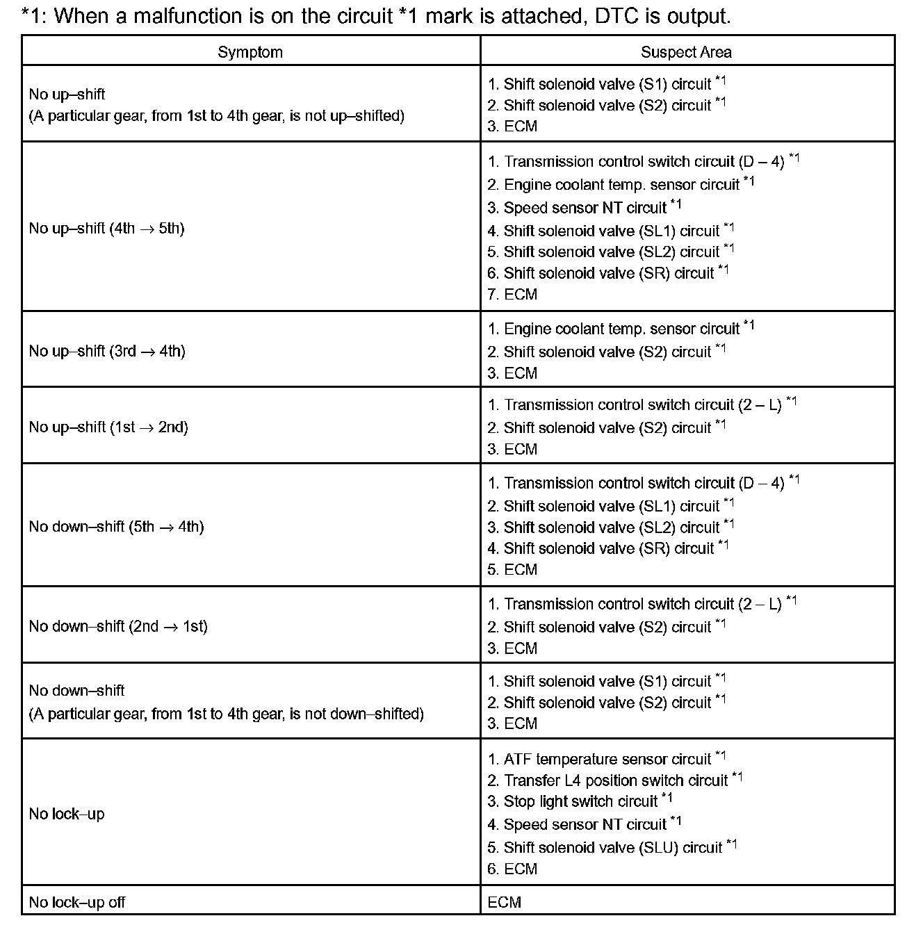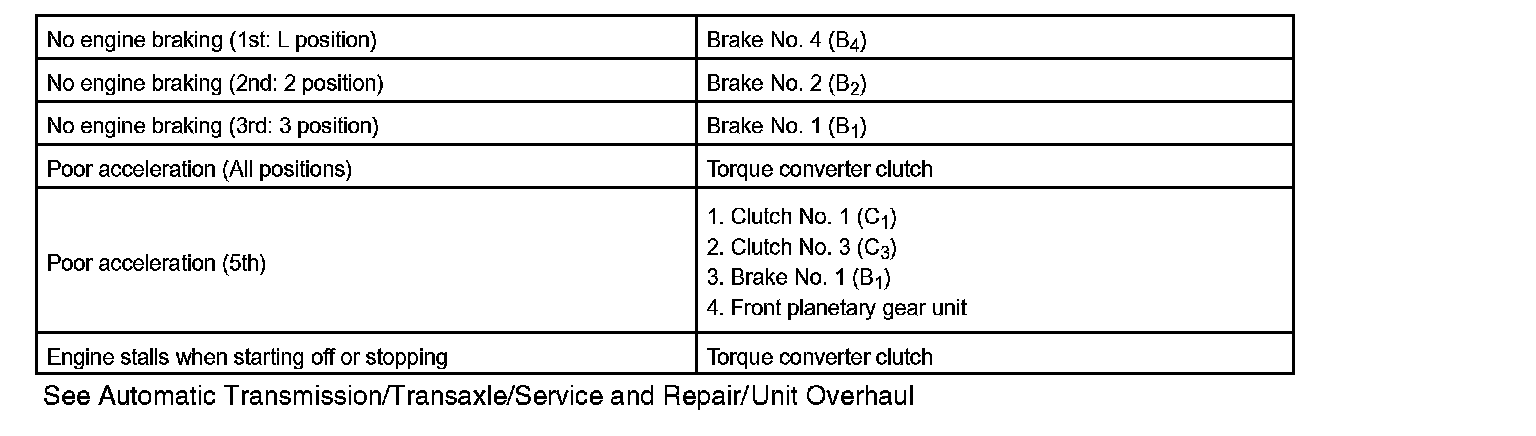 PROBLEM SYMPTOMS TABLEIf a normal code is displayed during the diagnostic trouble code check although the trouble still occurs, check the electrical circuits for each symptom in the order given in the charts and proceed to the troubleshooting.