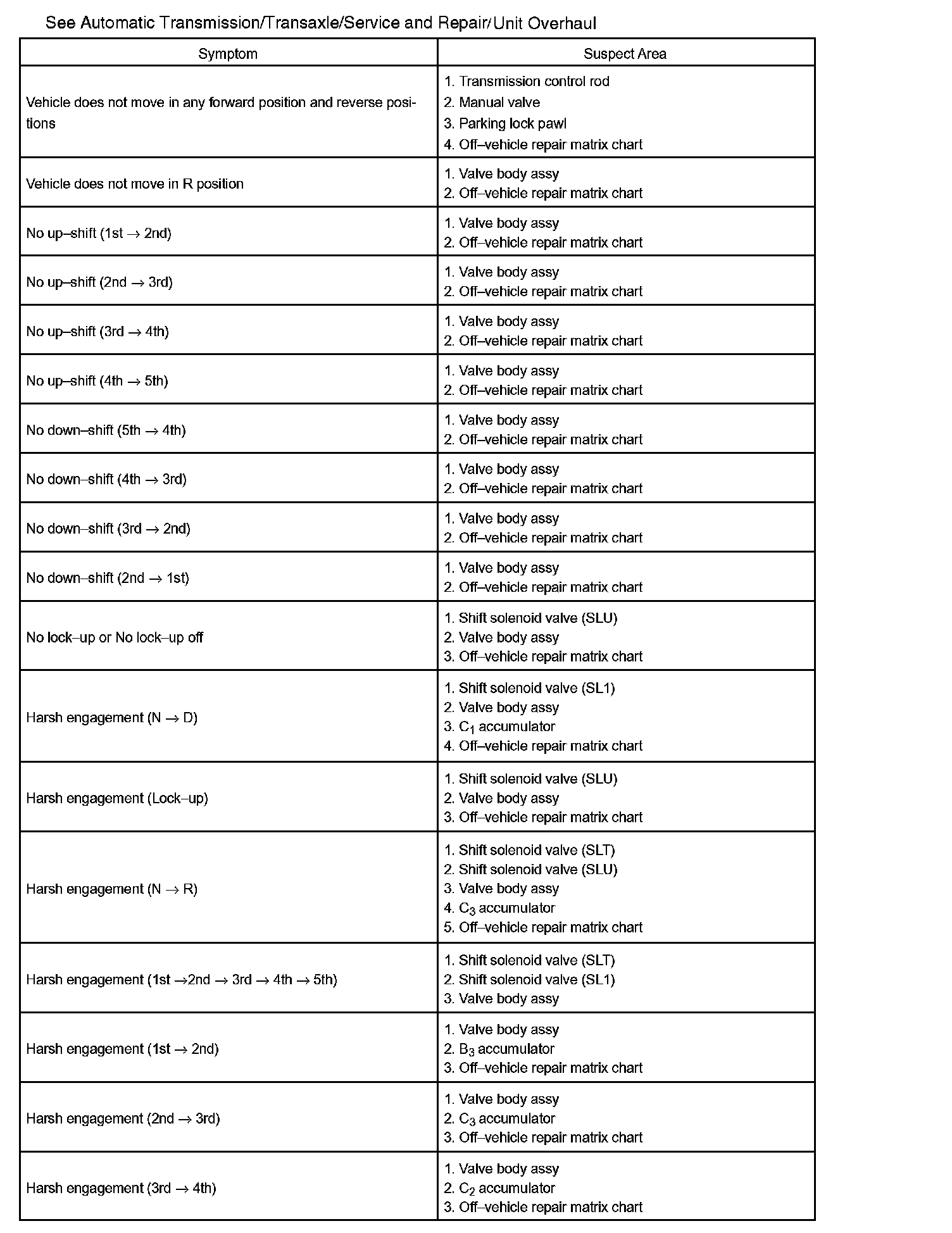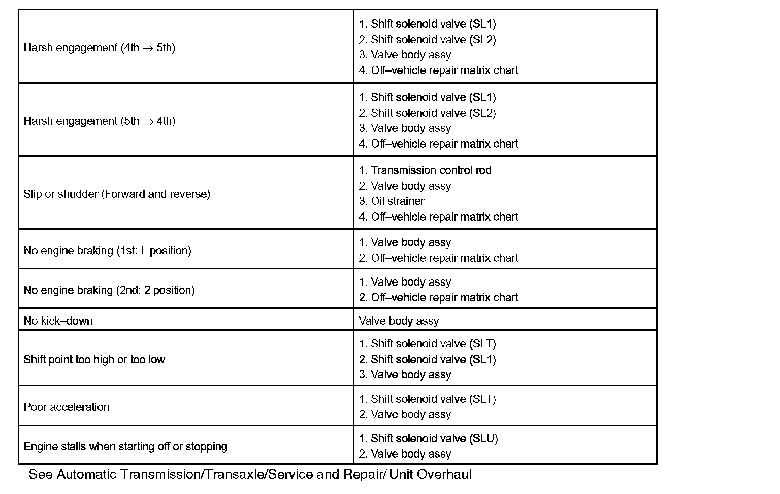 Chart 2: On-vehicle Repair Matrix Chart