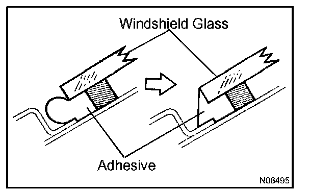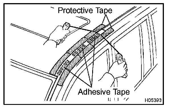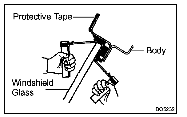 d. Hold the windshield glass in place securely with a protective tape or equivalent until the adhesive hardens.