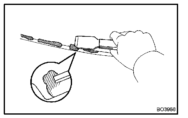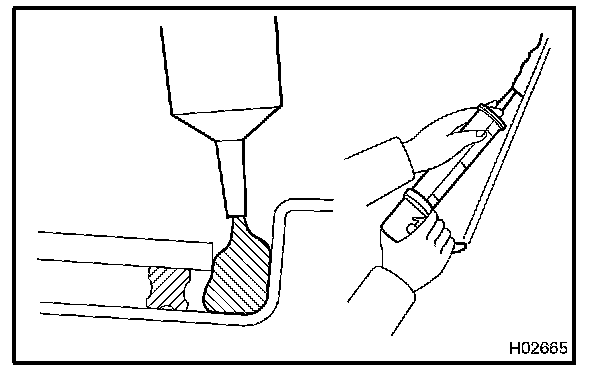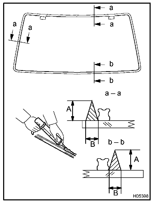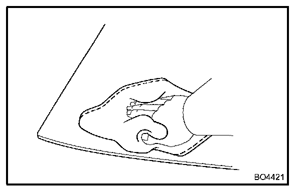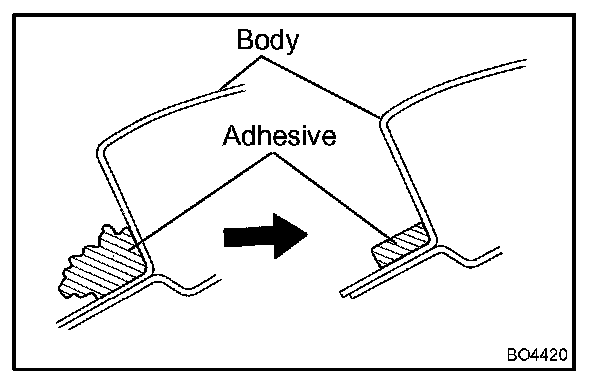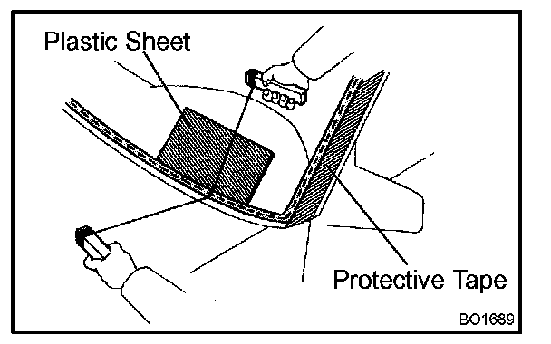 NOTE: When separating the glass, take care not to damage the paint and interior and exterior ornaments. To prevent scratching the safety pad from scratching when removing the windshield, place a plastic sheet between the piano wire and the safety pad.