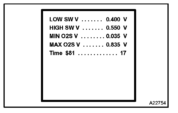 NOTE: Until the HO2 sensor monitor runs to completion, when it fails to complete or when the ignition switch is turned to OFF, the tester screen displays the upper and lower viewable limit values for the monitor (for example, voltages: 0 V and 1.275 V, seconds: 0 and 10.2, Test Value: 0 and 255).