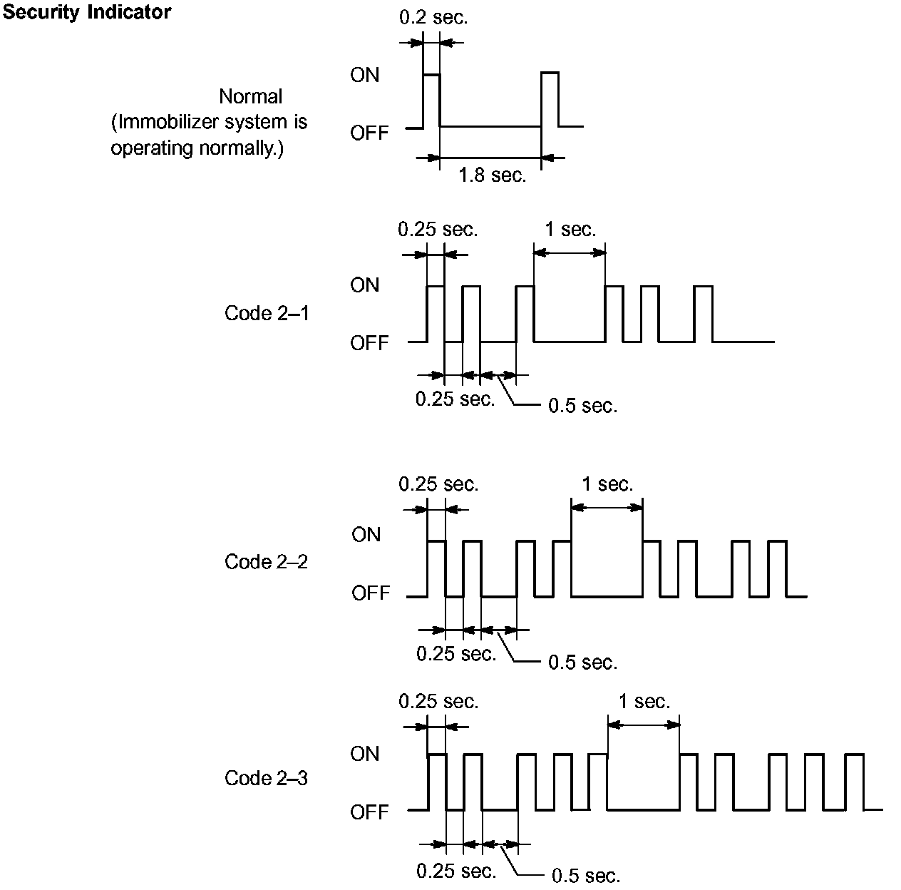 - When the immobilizer system is operating normally and the key is pulled out, the security indicator blinks continuously.
