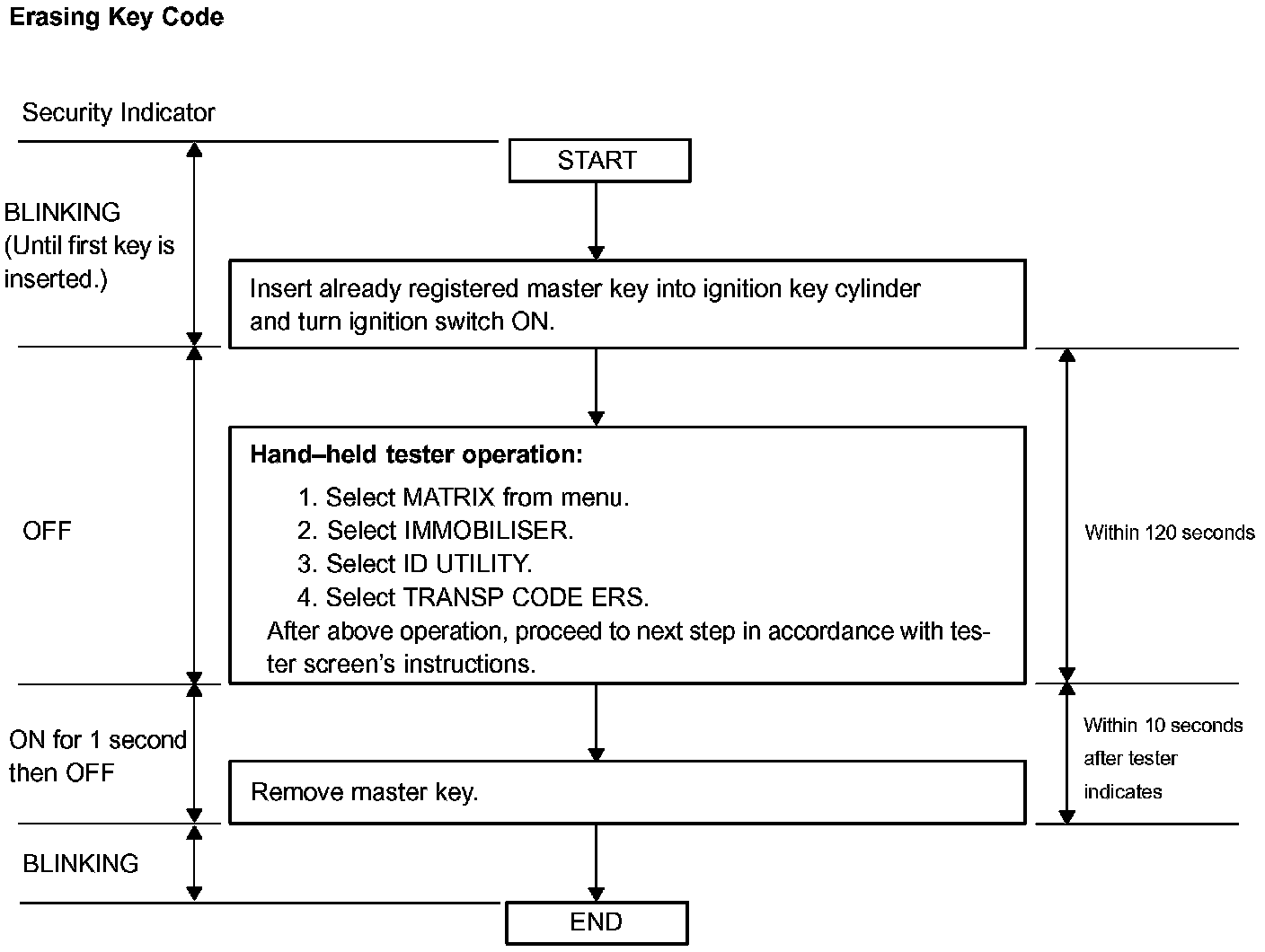 - A brief outline of procedures for key code erasure is shown on the illustration. For more detailed information, please refer to the hand-held tester screen's instructions.