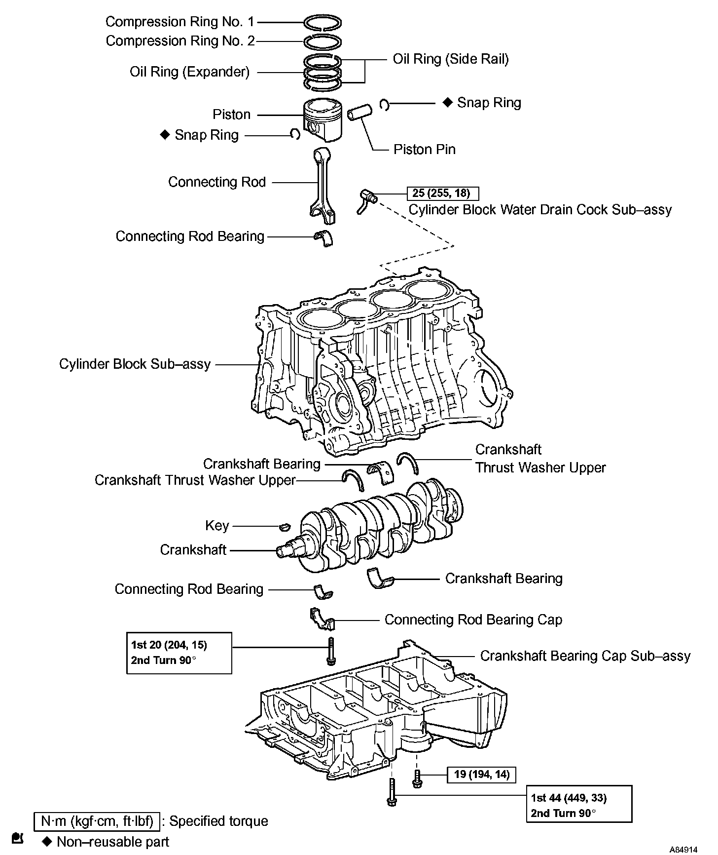 b) Push the piston, connecting rod assembly and upper bearing through the top of the cylinder block.