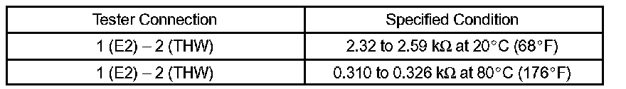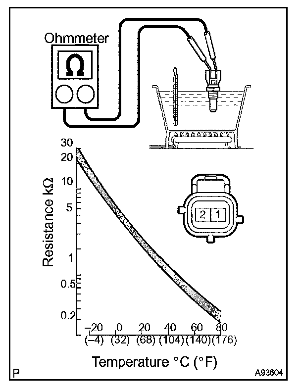 NOTE: If checking the engine coolant temperature sensor in water, be careful not to allow water to intrude into the terminals. After checking, wipe up water on the engine coolant temperature sensor. If the result is not as specified, replace the engine coolant temperature sensor.