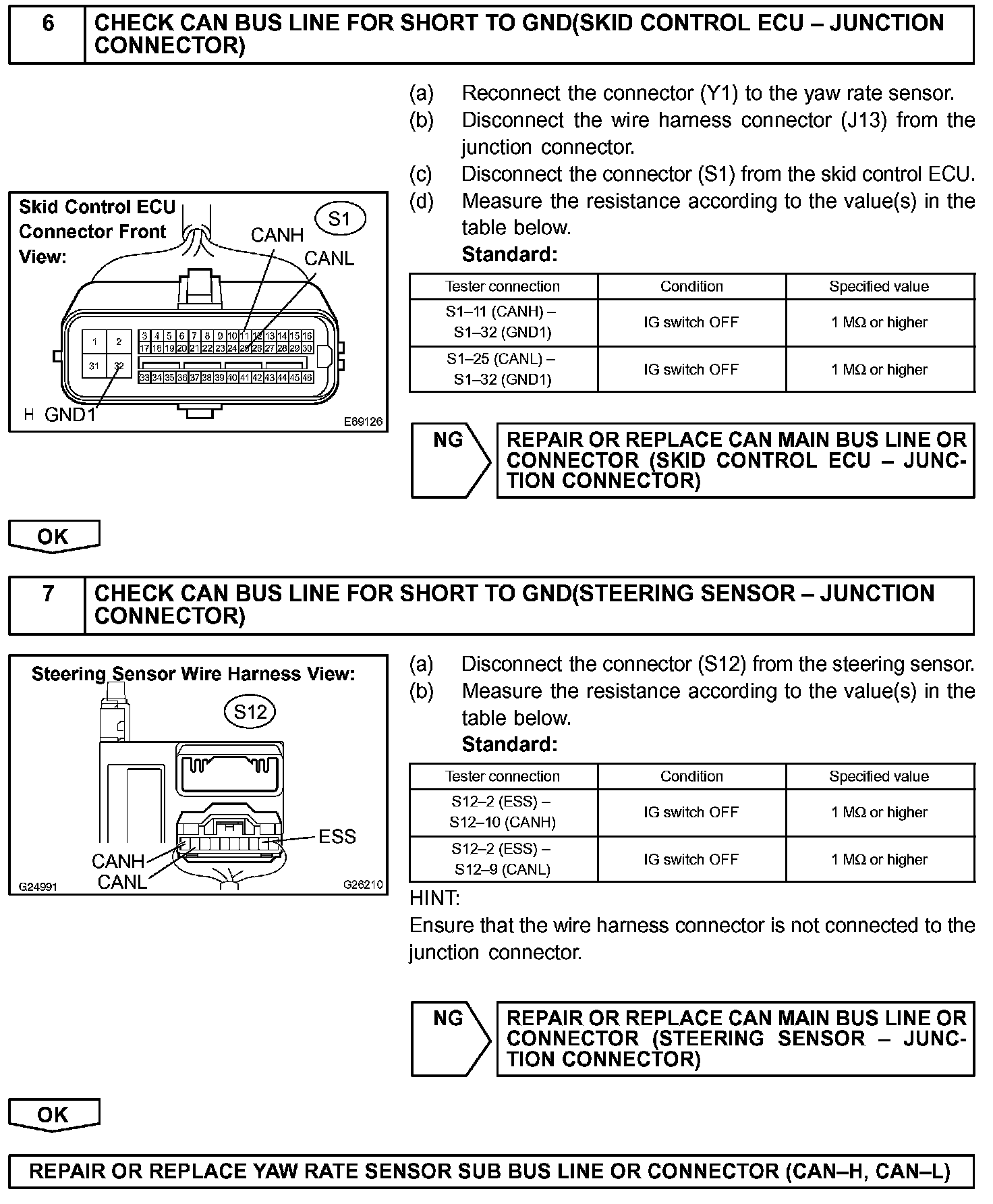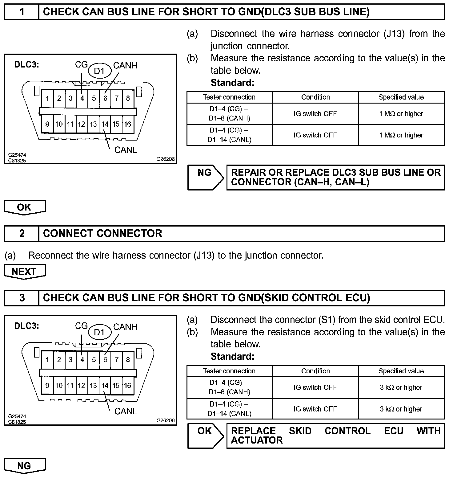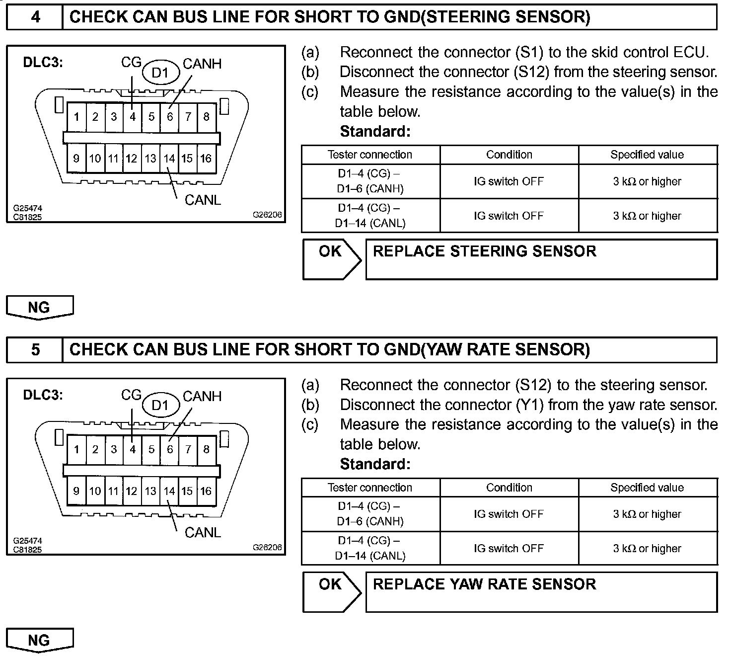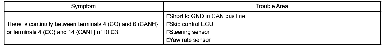 A short to GND is suspected in the CAN bus line when there is continuity between terminals 4 (CG) and 6 (CANH) or terminals 4 (CG) and 14 (CANL) of the DLC3.