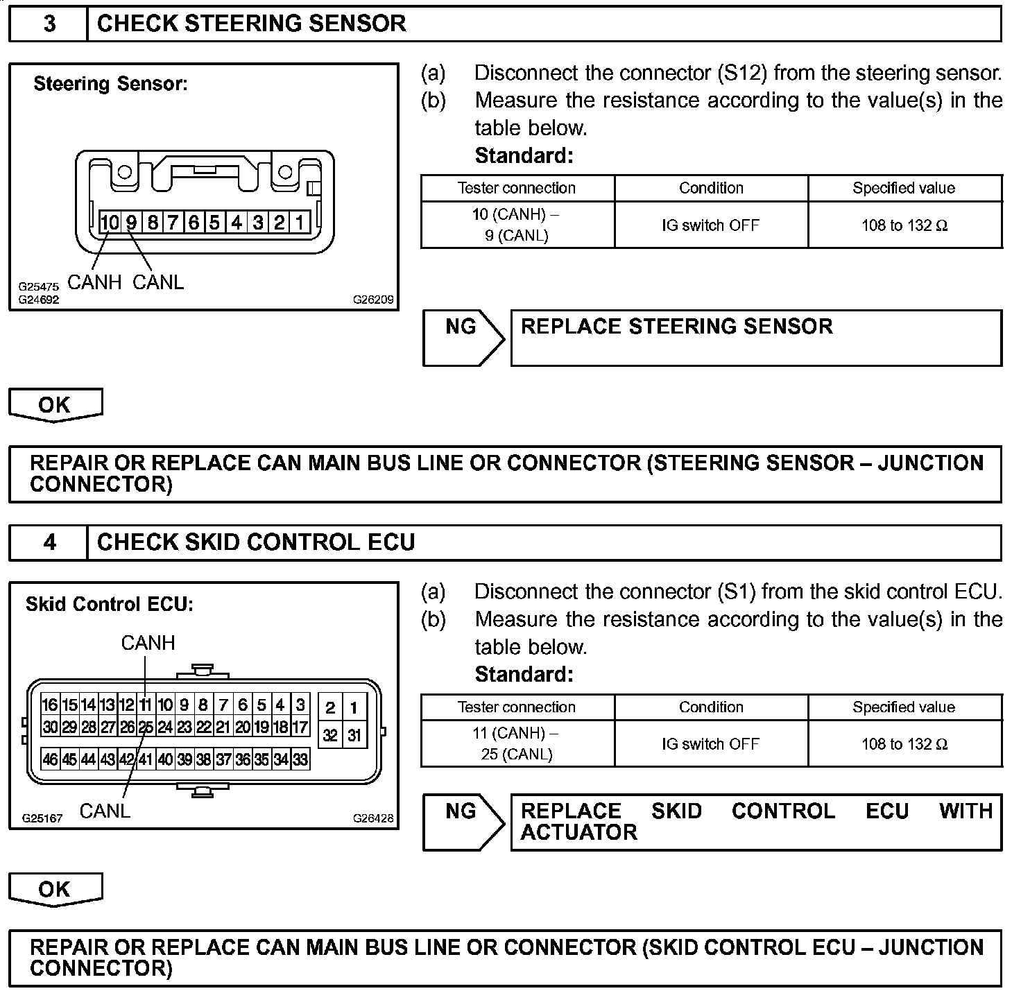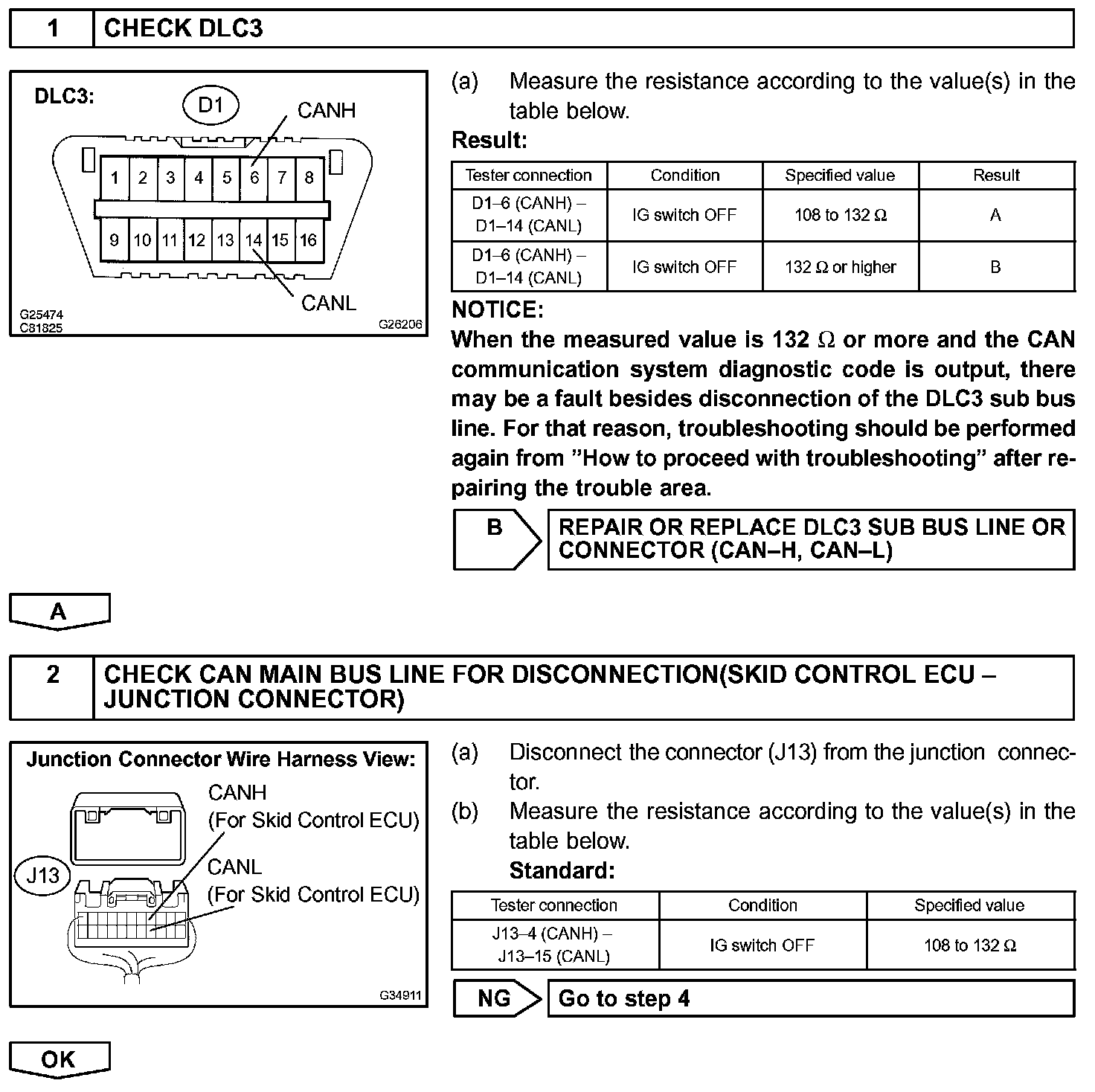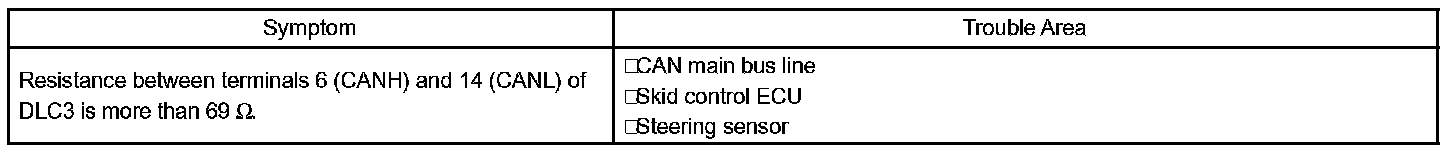 The CAN main bus line and DLC3 sub bus line may have a disconnection when the resistance between terminals 6 (CANH) and 14 (CANL) of the DLC3 is more than 69Ohms.