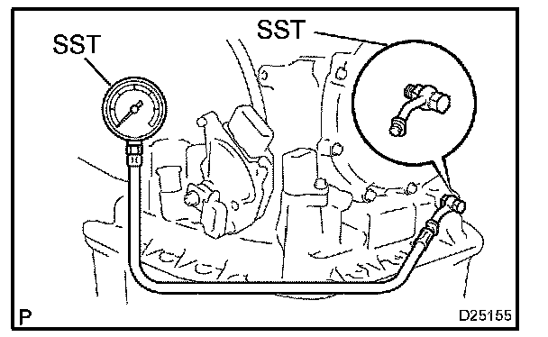 2. Remove the test plug on the left side of the transaxle case and connect SST.