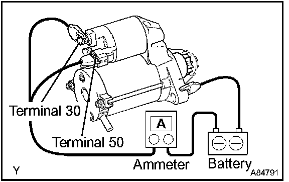 3. Connect the battery and an ammeter to the starter as shown in the illustration.