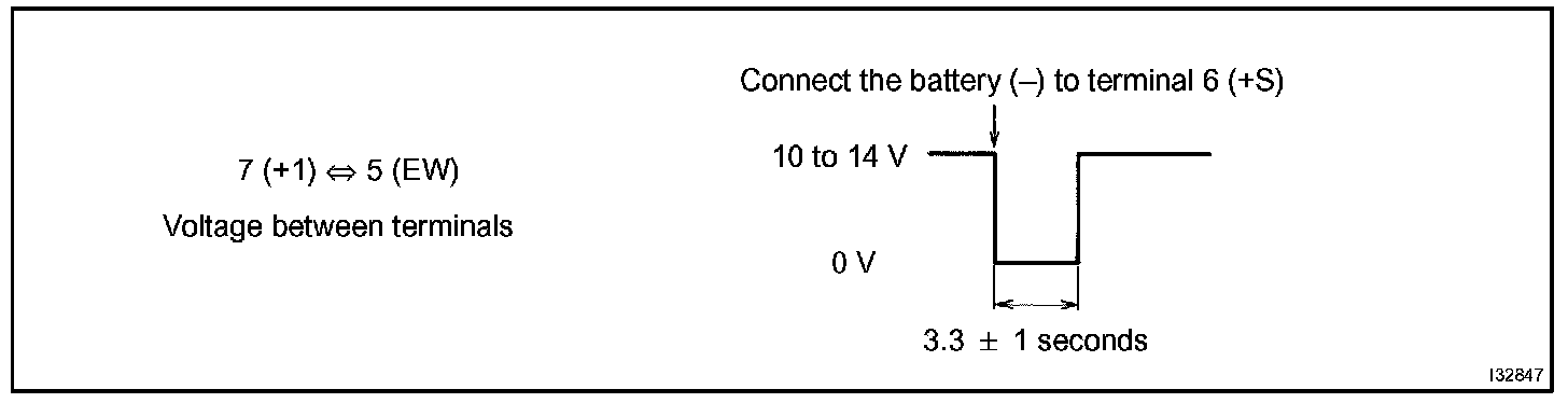 5. Connect the battery (-) to terminal 6 (+S) of the connector. Operate the intermittent wiper relay and check voltage between terminal 7 (+1) and terminal 5 (EW).